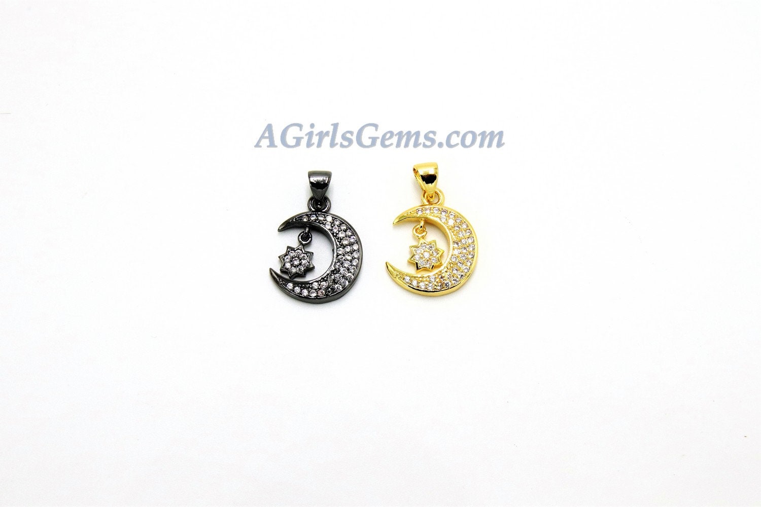 Moon Star Charm Pendant, CZ Micro Pave *Cute* *In Motion* Dangle Star Charms, Black/18 K Gold Plated 19 x 20 mm
