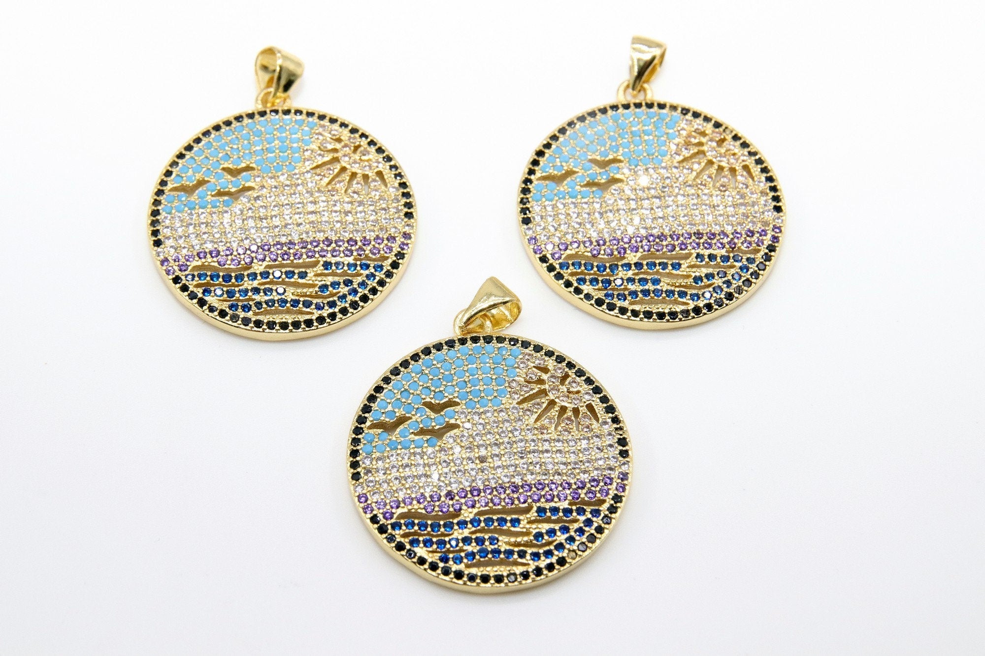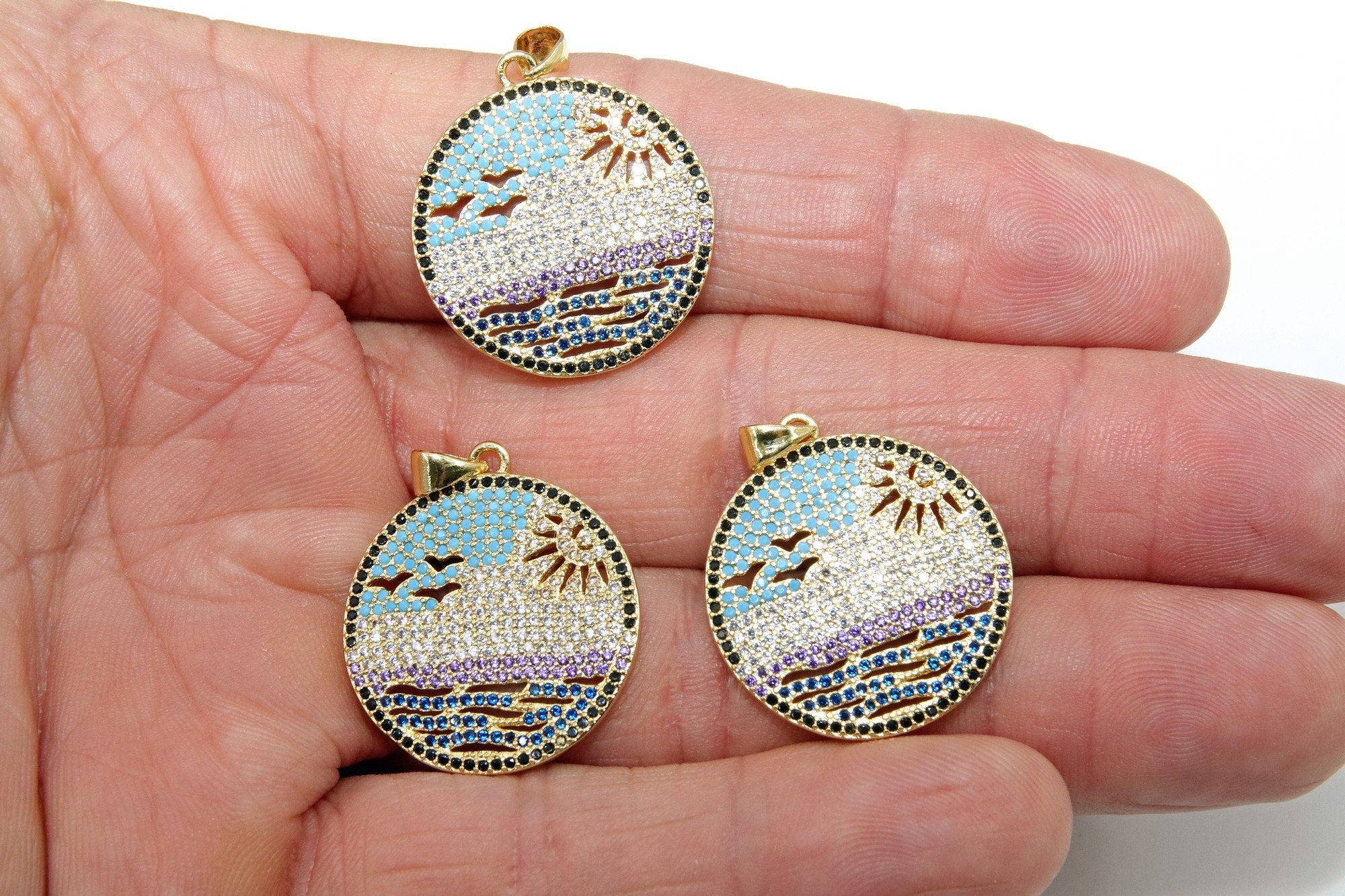 CZ Micro Pave Beach Scene Pendant, Gold Tropical Ocean Waves #802, Birds