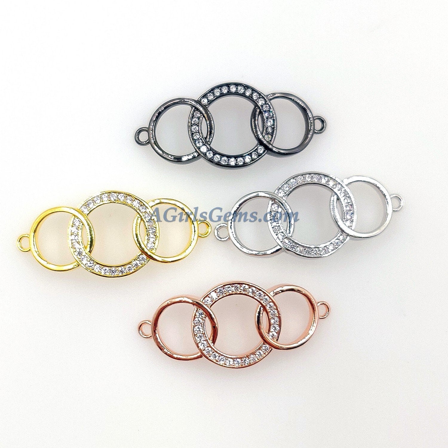 CZ Micro Pave Bracelet Bar Charm Connector, Long Bar 18 k Rose Gold/Silver/Gold/Black Rhodium Plated Curved 2 Loop Circles Jewelry Findings