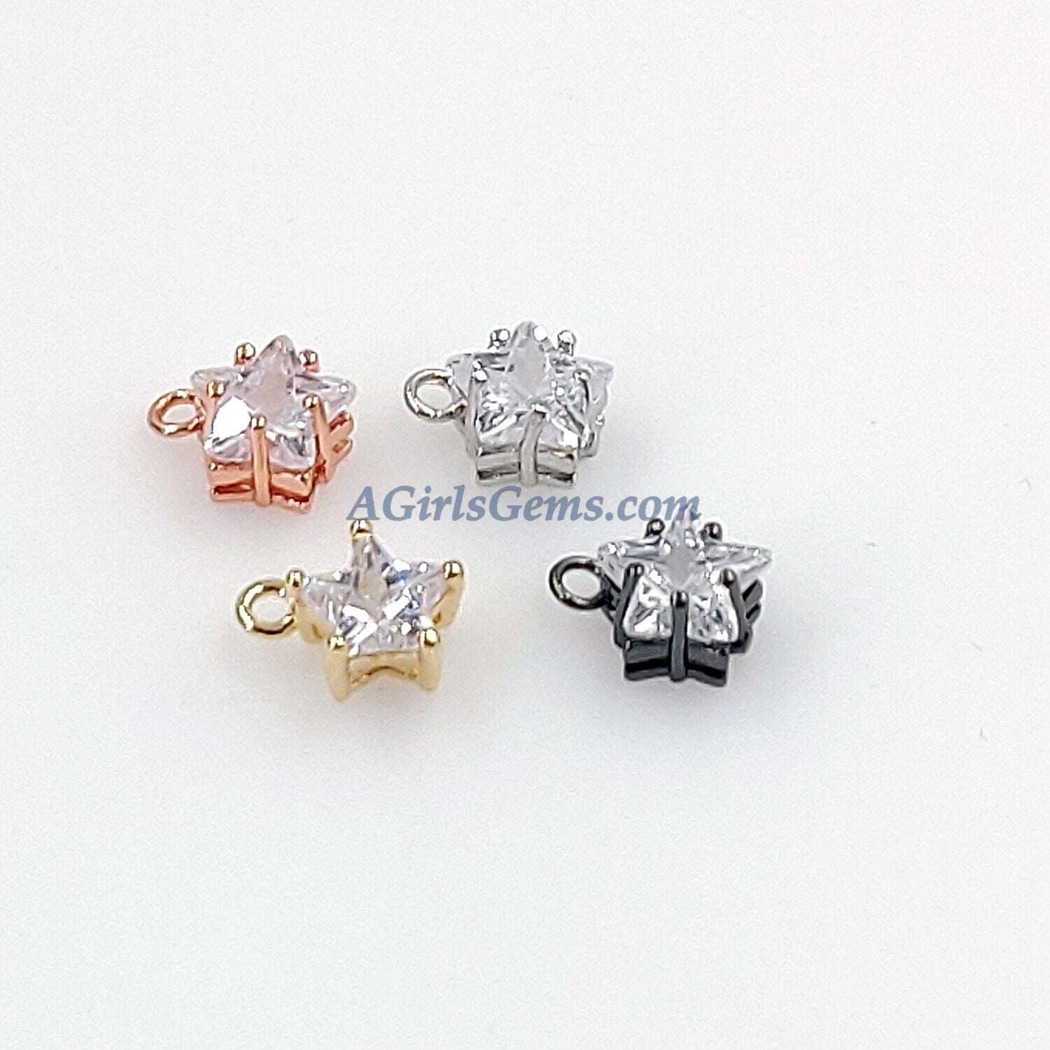 CZ Solitaire Star Charms - 3 Pcs - Tiny Star Dangles, 8 x 10 mm Cubic Zircons, Black/Silver/Rose/Gold Pave Crystal Earring Findings/Choker