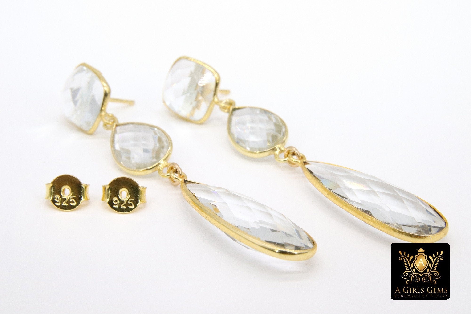 Clear Crystal Quartz Stud Earrings, Gold 925 Teardrop Gemstone, Long Clear Bridal Earrings