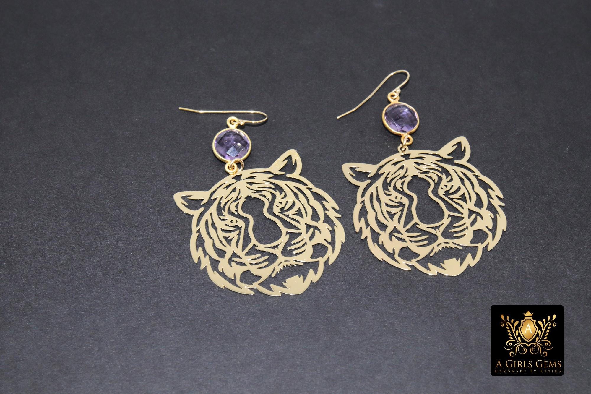 Gold Tiger Head Earrings, 14 K Gold Filled Hook Ear Wires AG# 2405, Purple Dangle LSU Gameday Jewelry