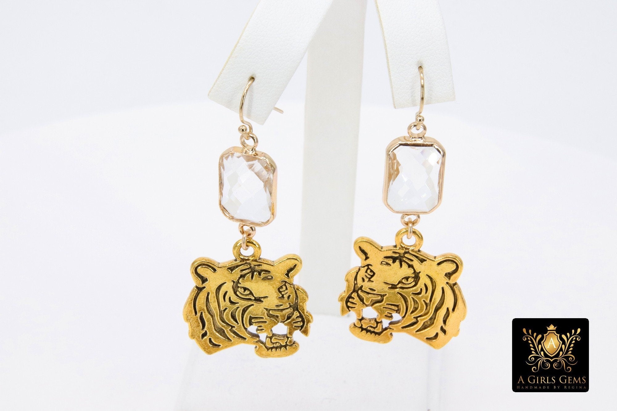 These earrings have Genuine 14 K Gold Filled Ball End Ear Wire Hooks for those who can't wear plated ear wires. Gold Filled ear wires are Hypo allergenic, lead free and nickel free. Choice of ear wires with only a tiger for short earrings or you can pick a square or rectangle plated faceted bezel Connector with the golden tiger head. Message us if you would like to customize your earrings.