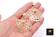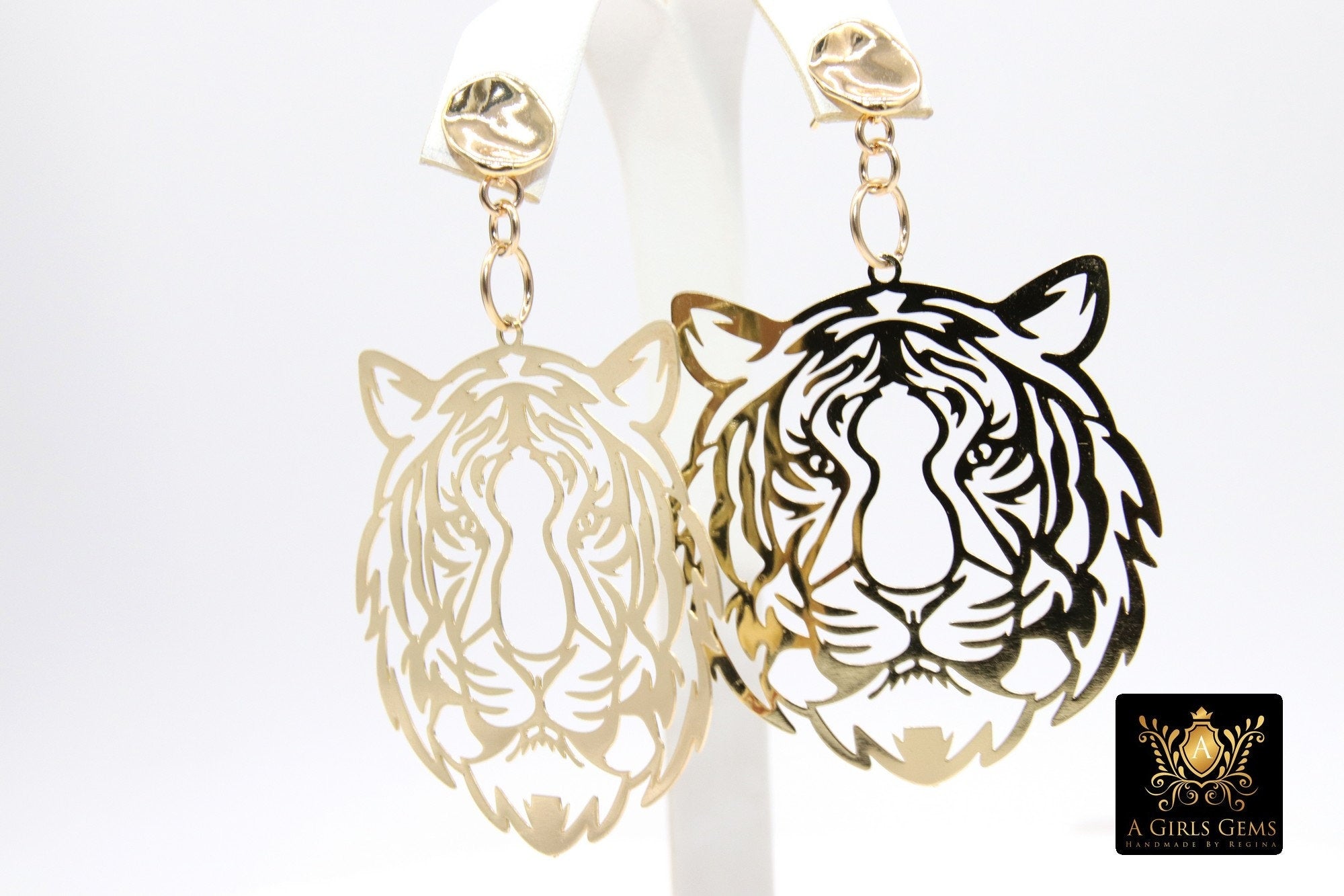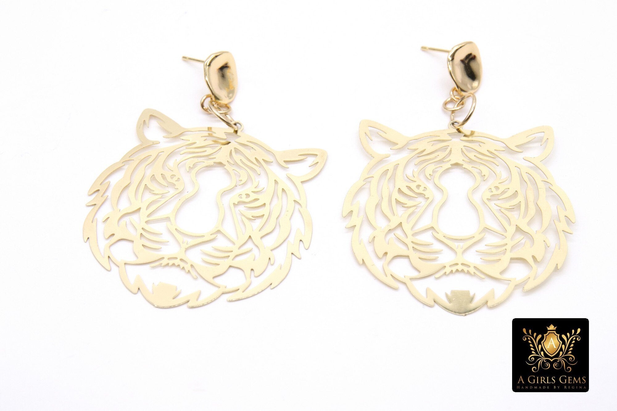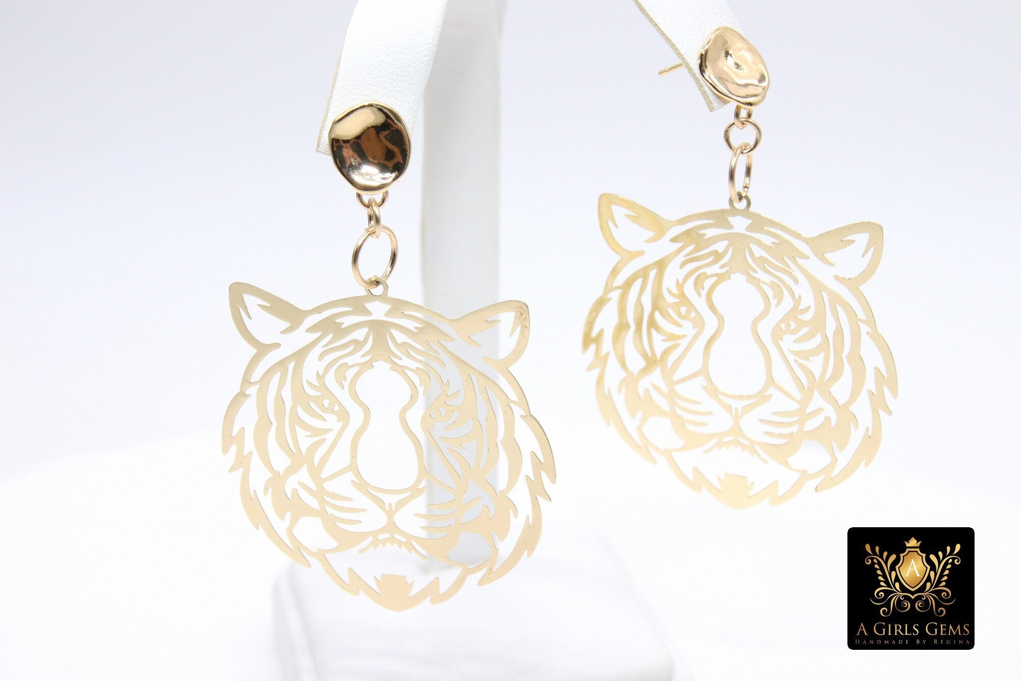 These earrings have 10 mm earring studs in genuine gold plated. Come with silicon backs and gold plated tiger heads. 14 k gold filled rings are used. Message us if you would like to customize your earrings.
