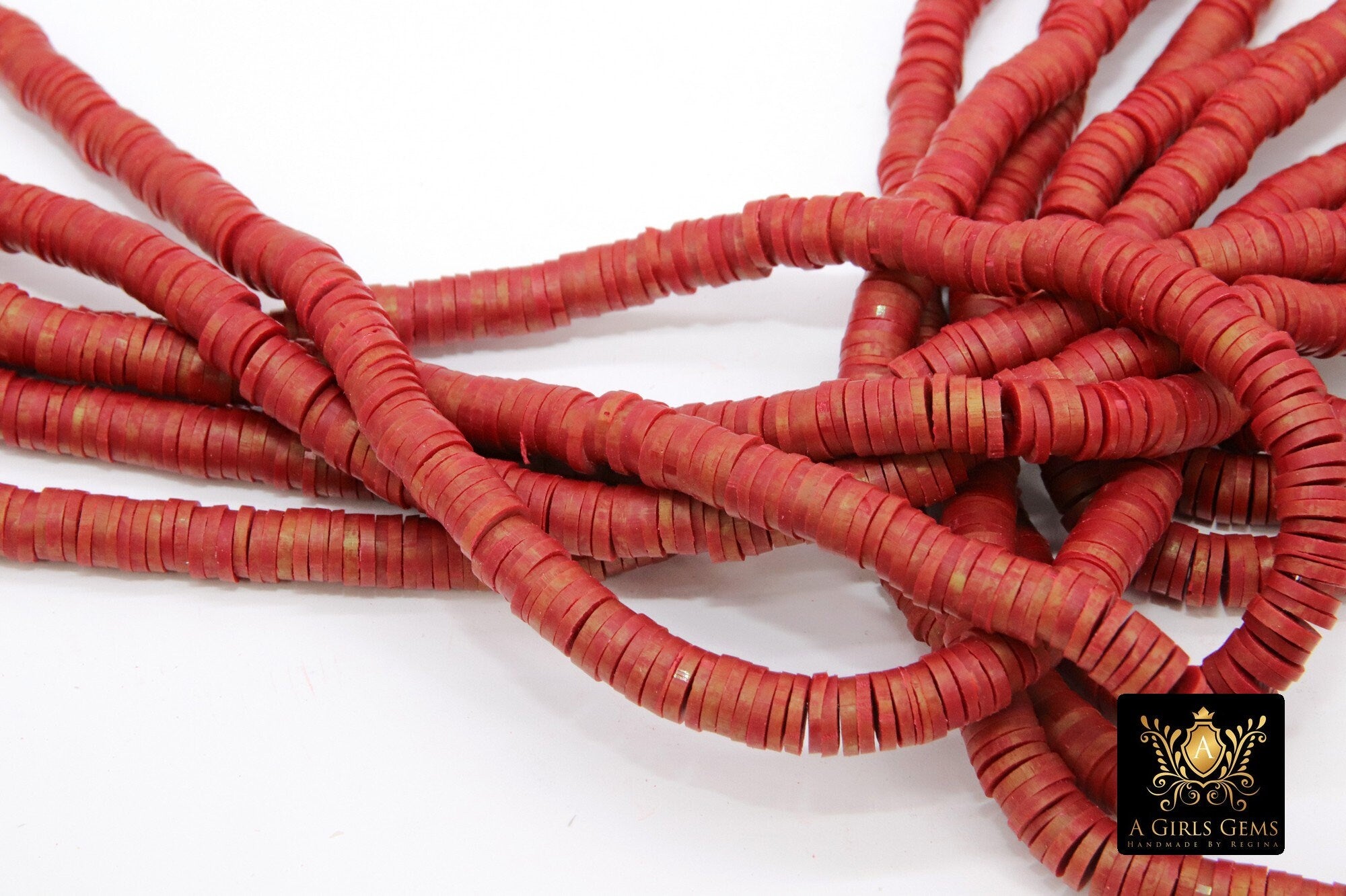2 Full Strands of Flat Heishi Beads in 6 mm in Burgundy Red with Hints of Gold throughout