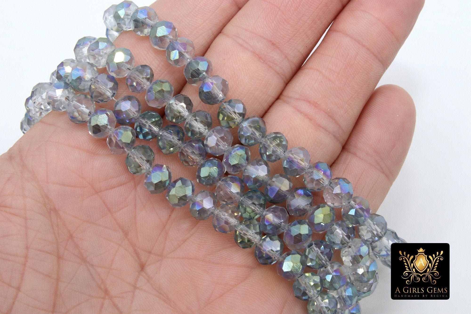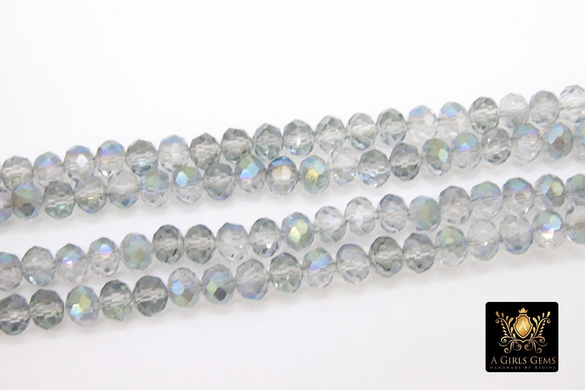 Blue Gray Crystal Beads, Shimmery Faceted AB Glass Rondelle Jewelry Beads BS# 90, sizes 8 x 6 mm 18 inch Strands