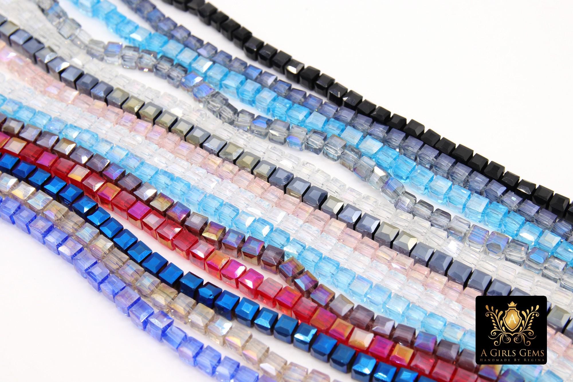 Crystal Cube Bead Strands, 4 mm Square Blue Red Beads BS #330, 4 mm Blue AB Crystals