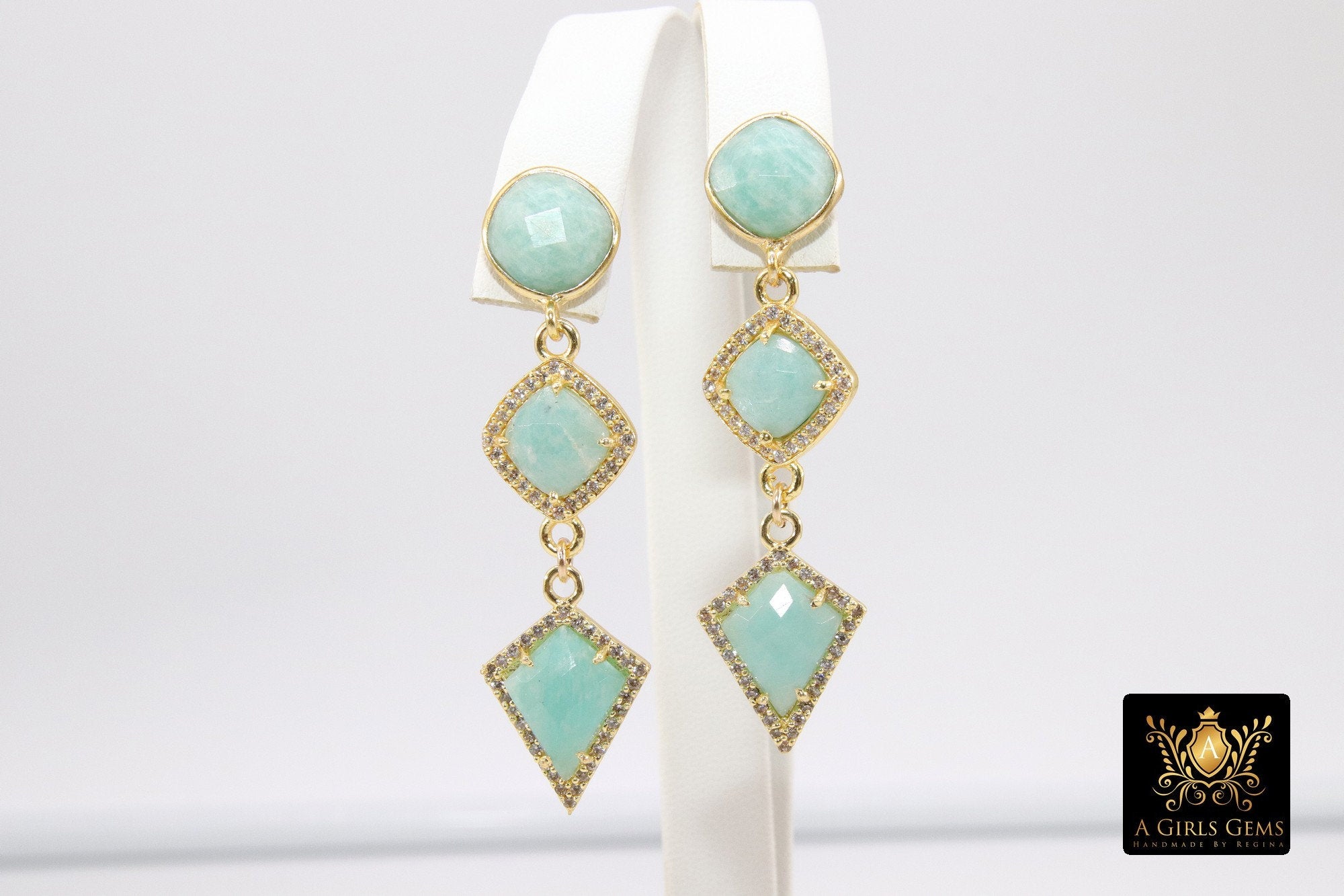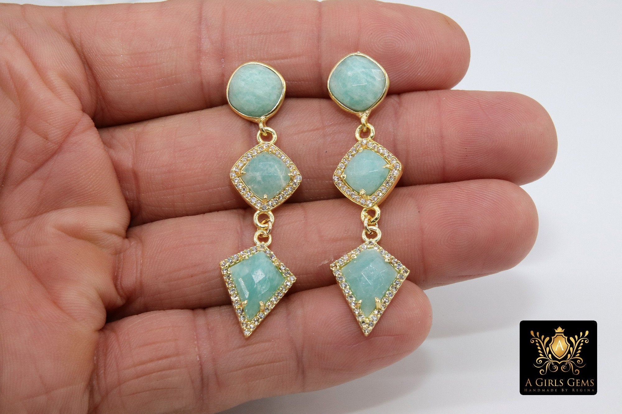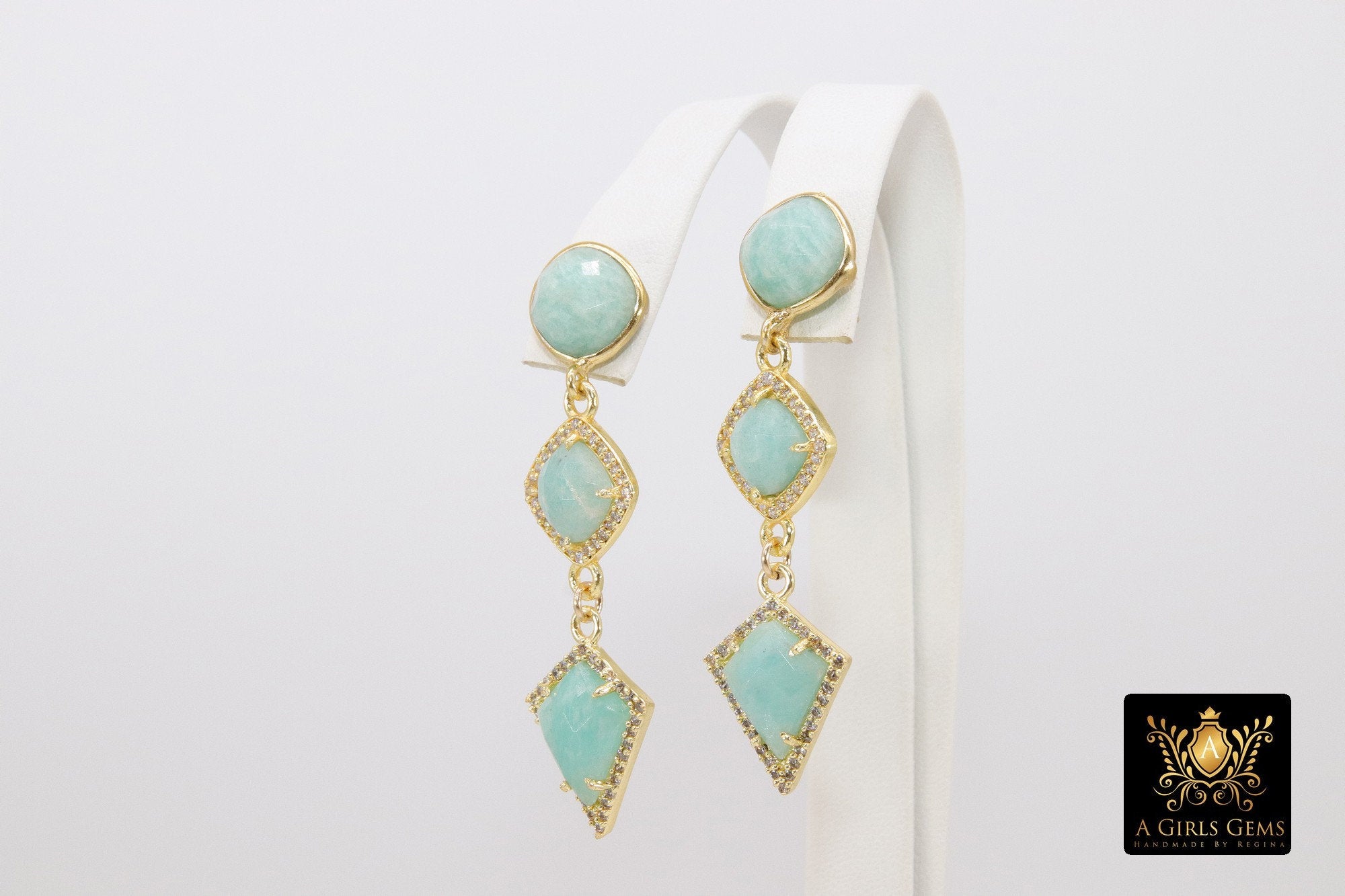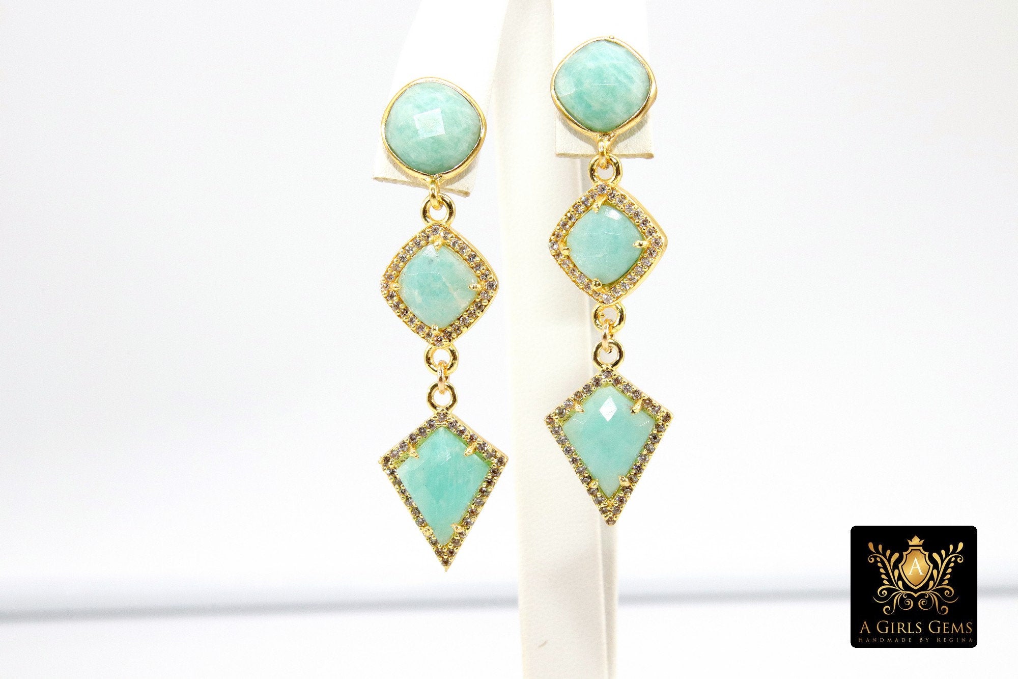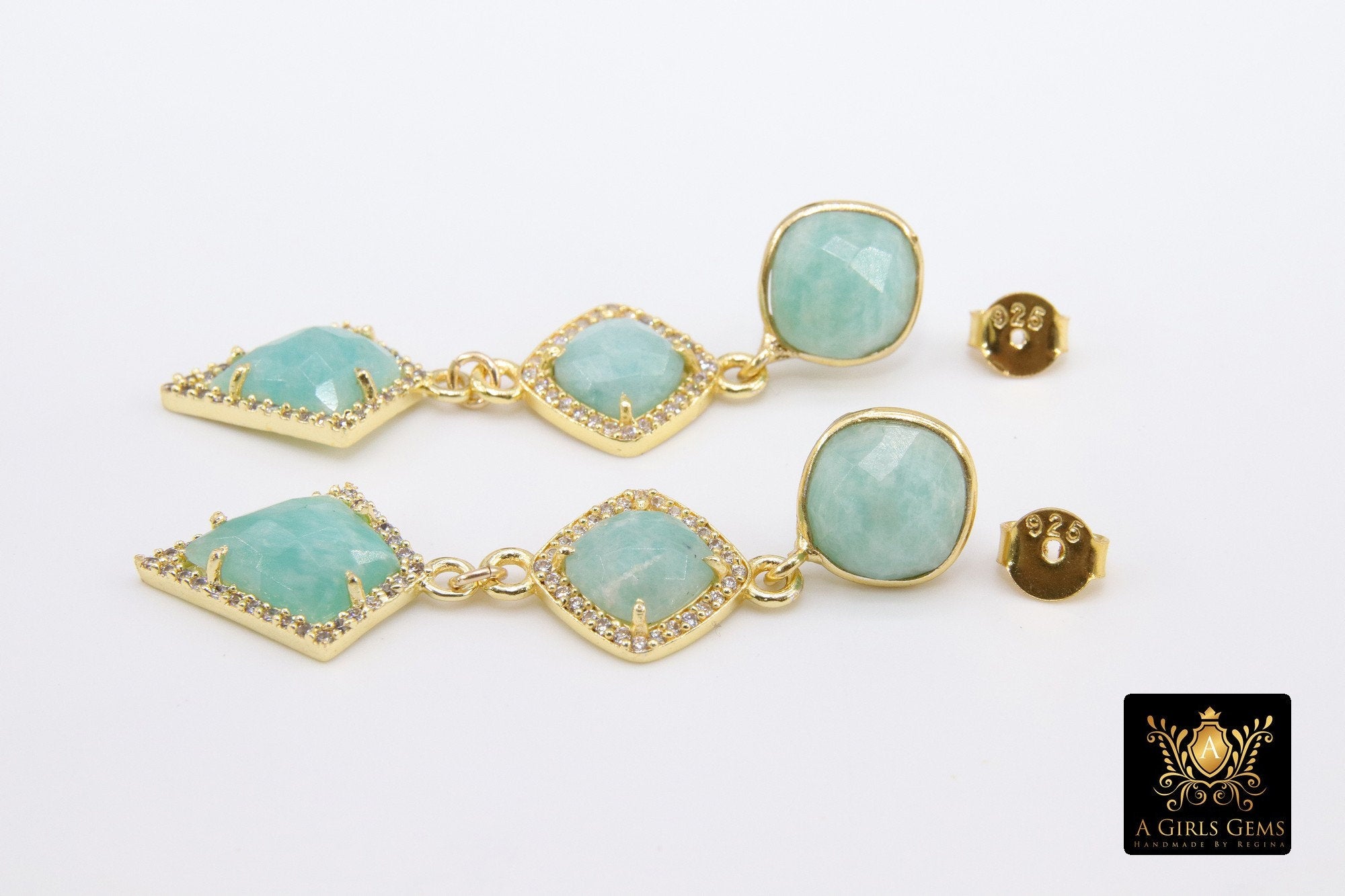 Amazonite Stud Earrings, Raw Turquoise Studs, Formal Jade Stone Stud Earrings, Mint Blue Dangle Gemstones, Gold, 925 Jewelry