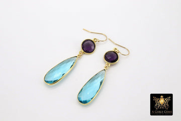 14 K Gold Blue Topaz Earrings, Amethyst Gemstones, Dangle Ear Wire Hooks, December Birthday