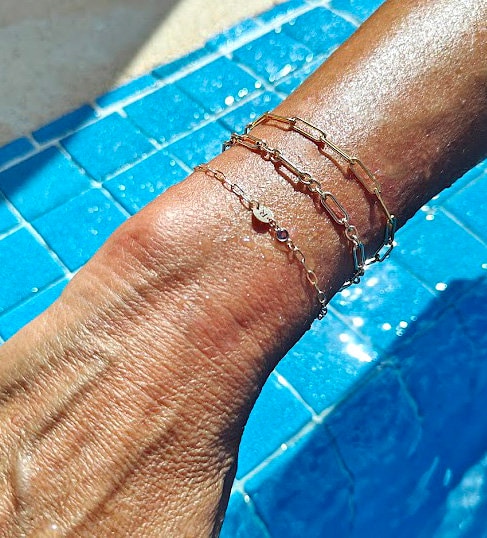 All of our 14 K Gold Filled chains, charms, or findings are Genuine 14/20 Gold Filled. To be called gold filled by US LAW, the gold needs to be very very thick, at least 5% of the weight. Please be sure you measure your wrist before your order as we make this per your selections and they are not refundable.