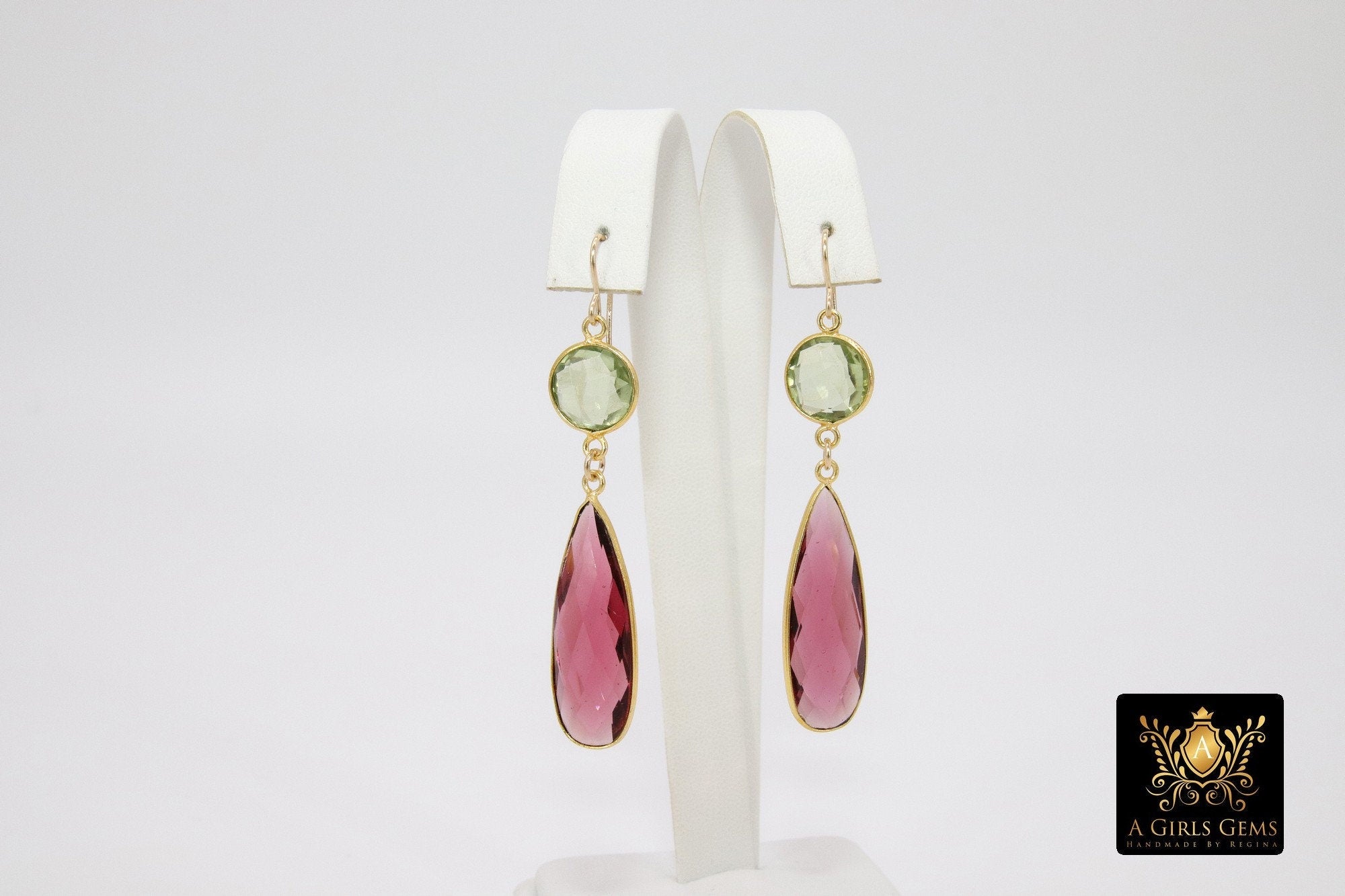 14 k Gold Fill Green Amethyst and Pink Tourmaline Earrings, Long Teardrop Gemstone Earrings, Watermelon Jewelry