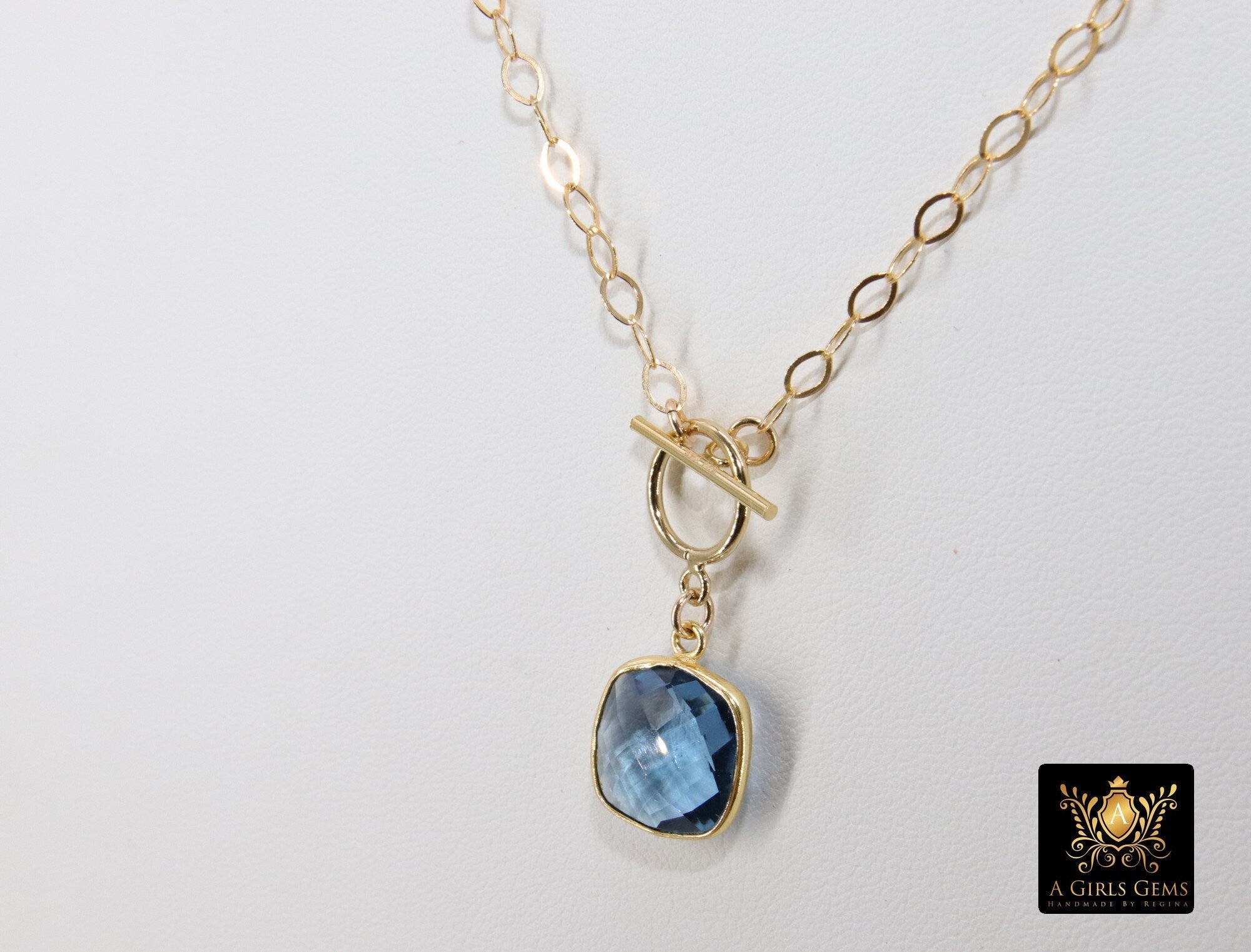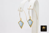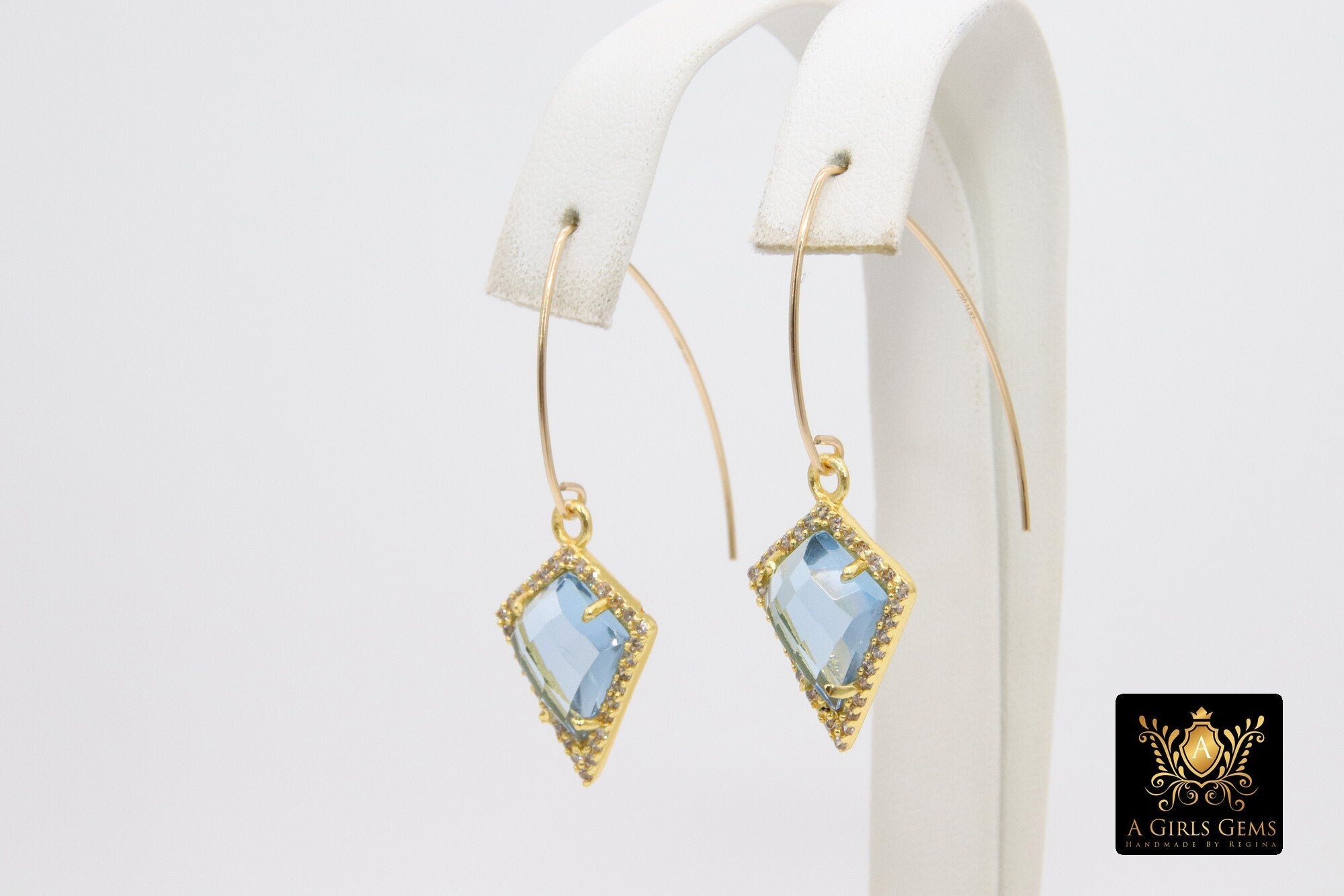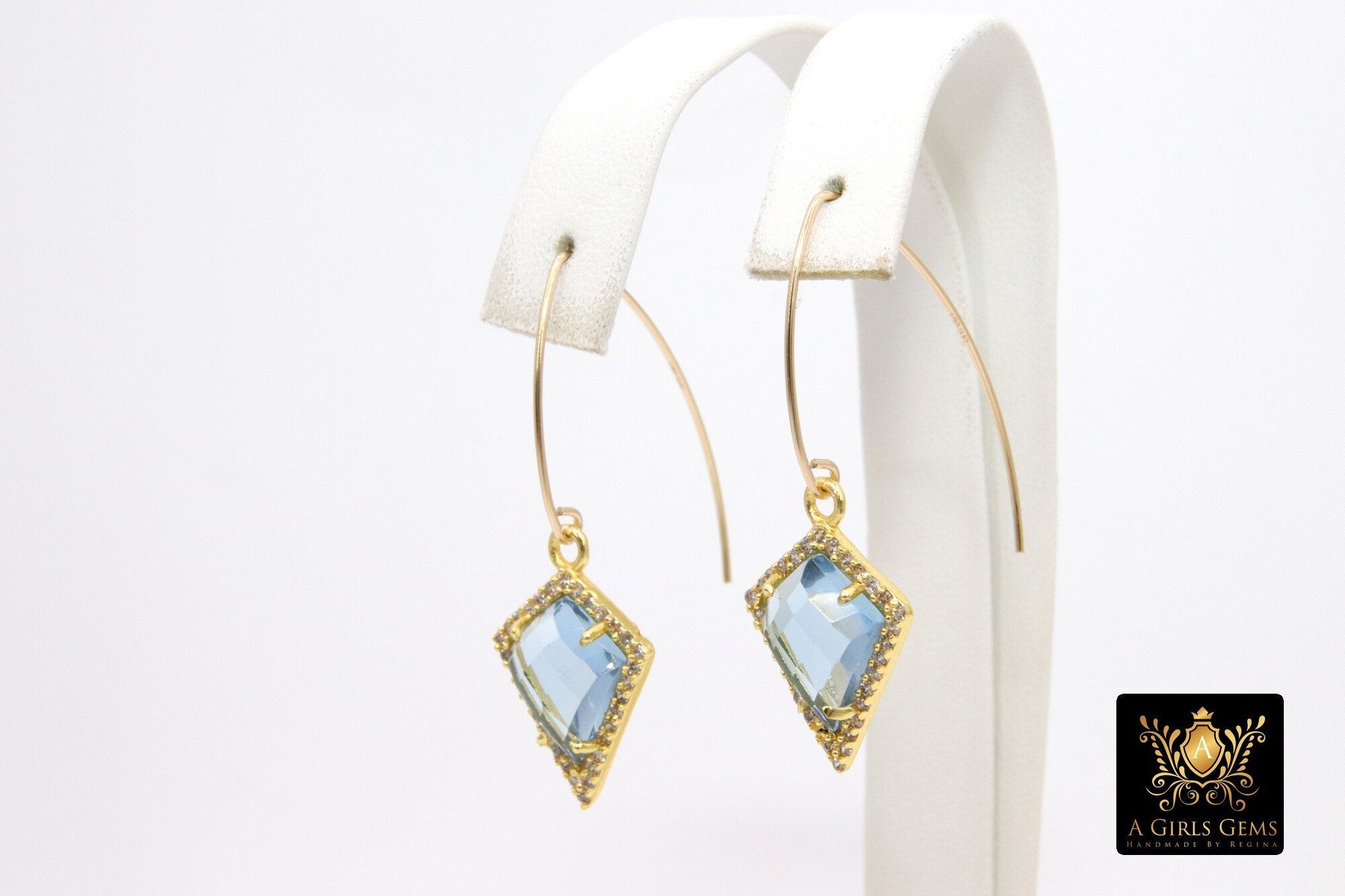 14 K Gold Blue Topaz Earrings, Triangle Gemstone Long V Wire Dangle Ear Hooks