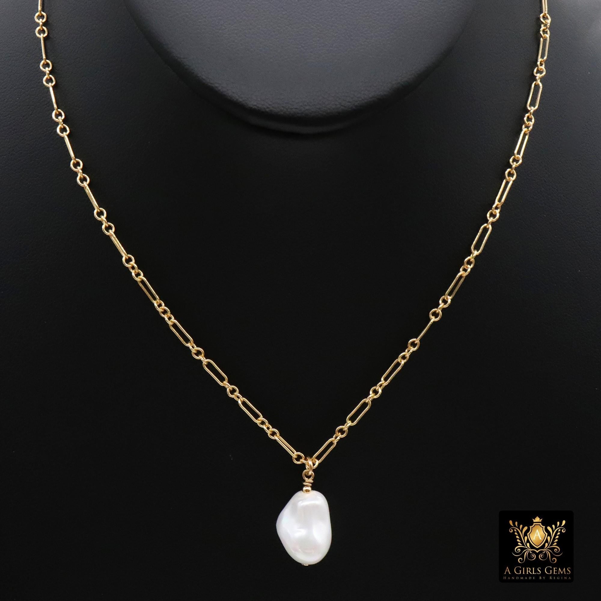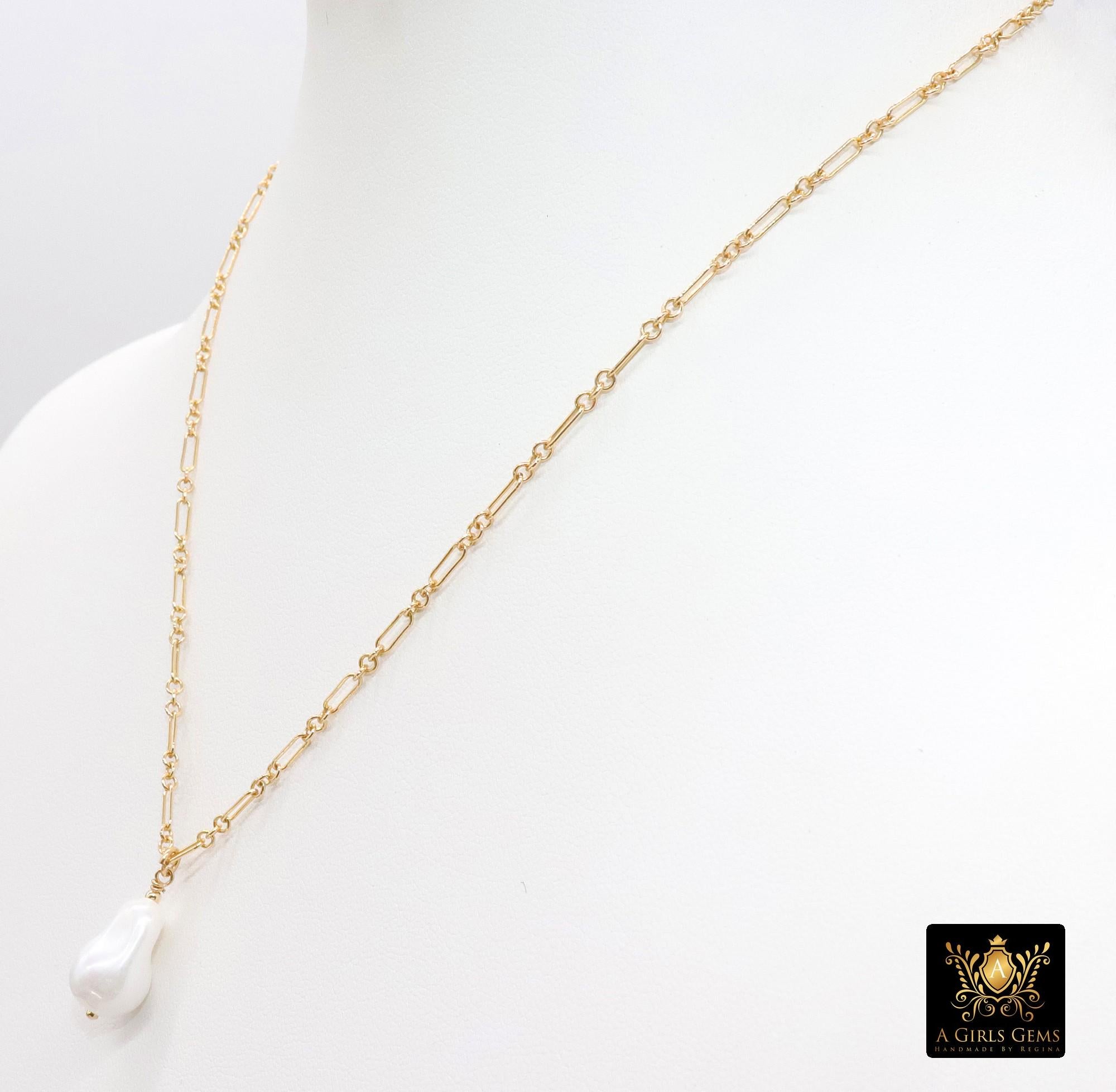 Elegant 14K Gold Filled Pearl Chain Link Necklace, Long Short Gold Dainty Chain With Large Baroque Pearl, Wire Wrapped Charm Necklace