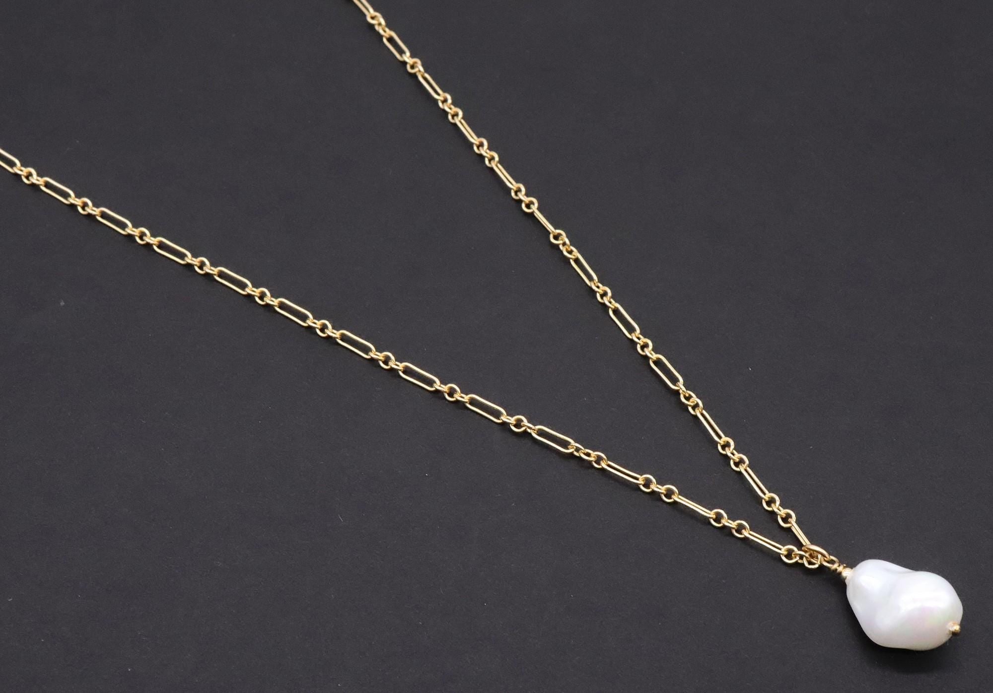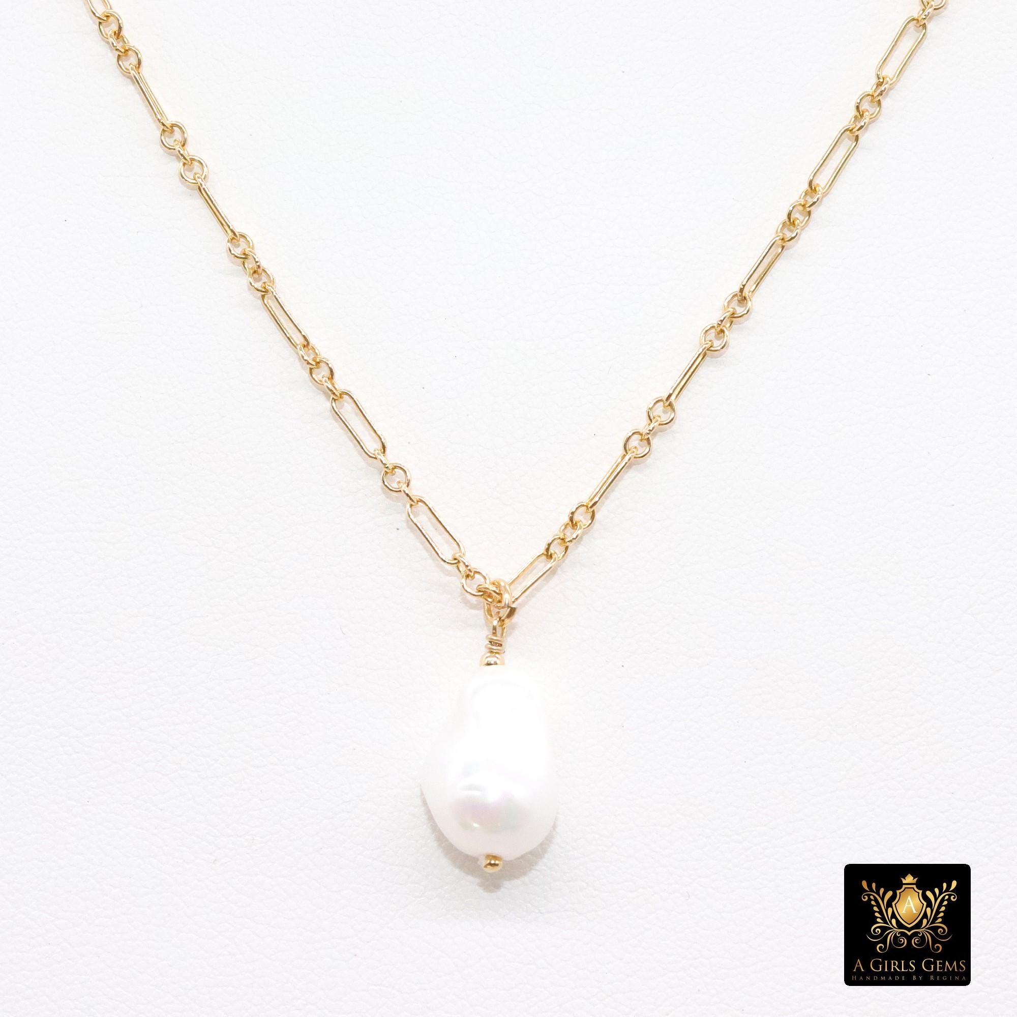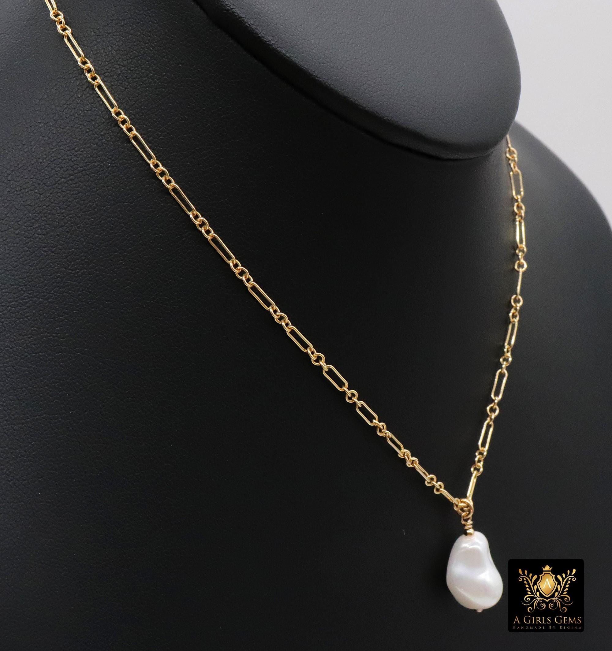 14K Gold Filled Baroque Pearl Paperclip Chain Necklace, Long Short Gold Chains With Large Pearl, Wire Wrapped Charm Necklace, Gifts For Her