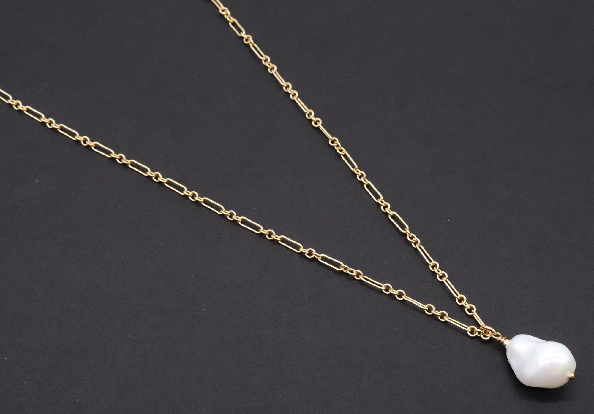 This necklace is on our 14 K Gold Filled Designer Rectangle Rolo Long Short Chains as seen in picture 1, ***NOT plated *** will last a lifetime. Includes all 14 K Gold Filled components as to not tarnish and be water resistant. A Genuine Baroque Pearl with 14 K Gold Filled Wire. Our most popular lengths are below. If you need a different length, please message us with any questions.