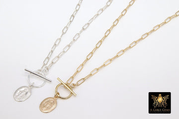Silver Virgin Mary Coin Necklace, 925 Sterling Silver Medal Toggle Wrap Necklace, Paperclip Rectangle Chain