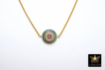 Gold CZ Rainbow Disc Necklace, Round Disc Box Chain Choker D E T A I L S: This necklace is on our Gold Matte box chains with the Rainbow Disc. It also comes with a 3 Inch 14 K Gold...