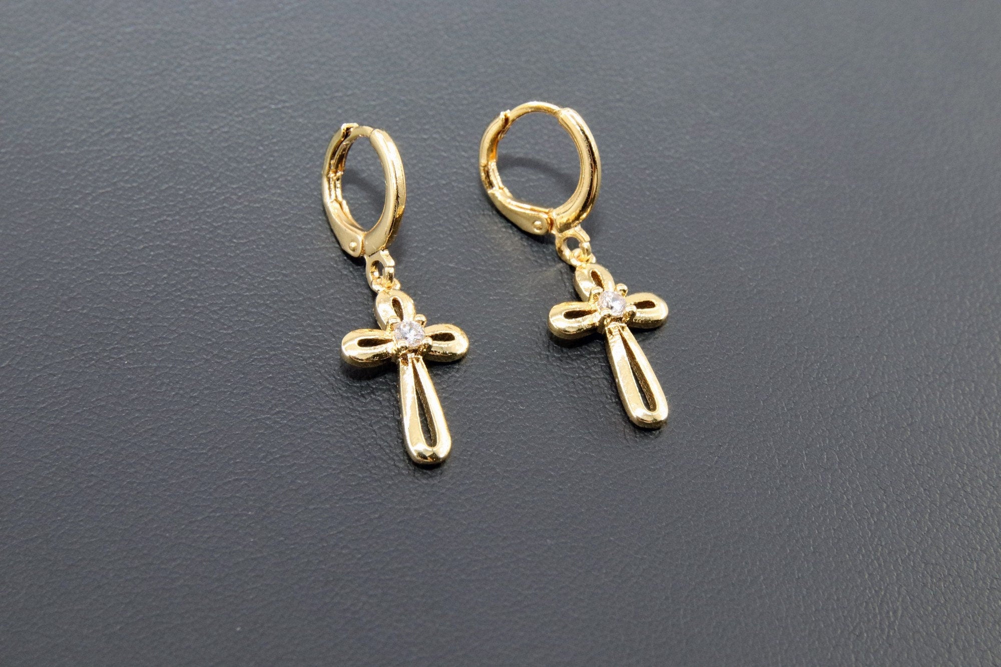 CZ Cross Hoop Earrings, Gold Huggie Latch back Earrings or Pendant Set, Minimalist Charm Hoop Earrings Religious Jewelry- 2 pc/1 Pair