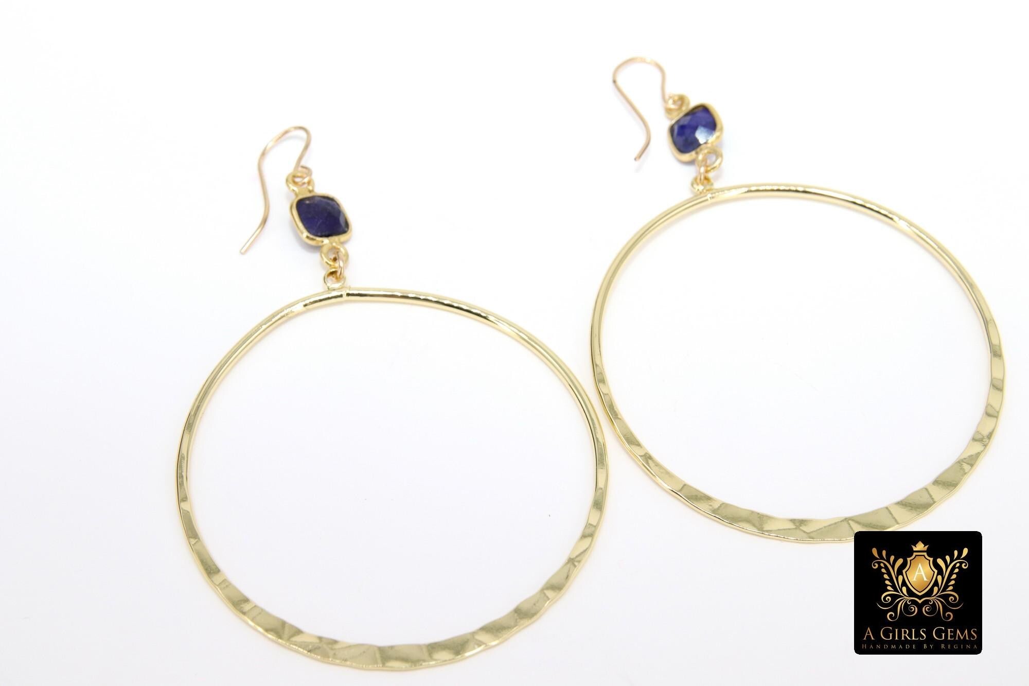 Gold Navy Blue Gemstone Hoop Earrings, 14 K Gold Filled Fancy Hook Ear Wires #692, Gold Plated Round Hoops with Sapphire Gemstone