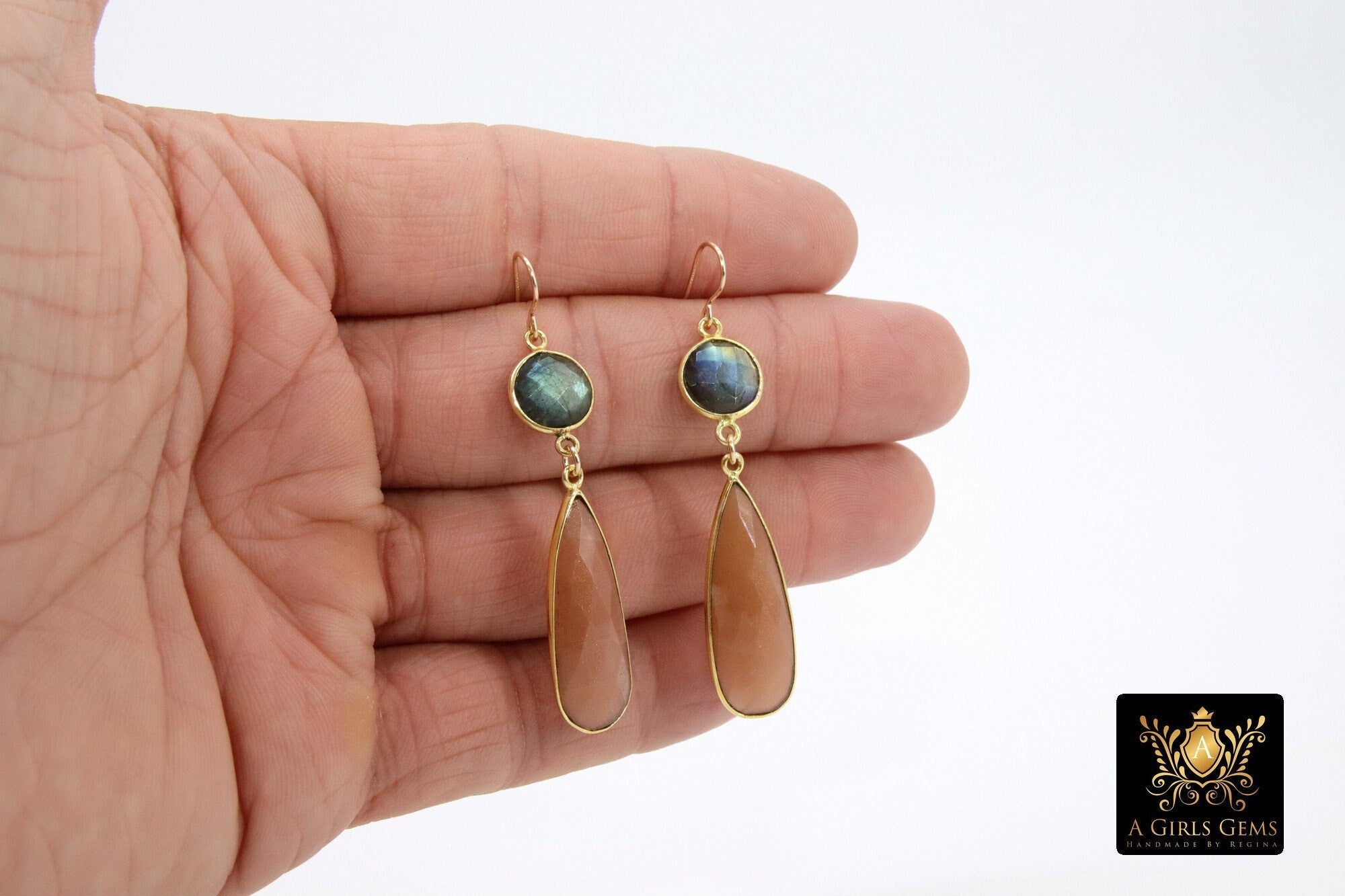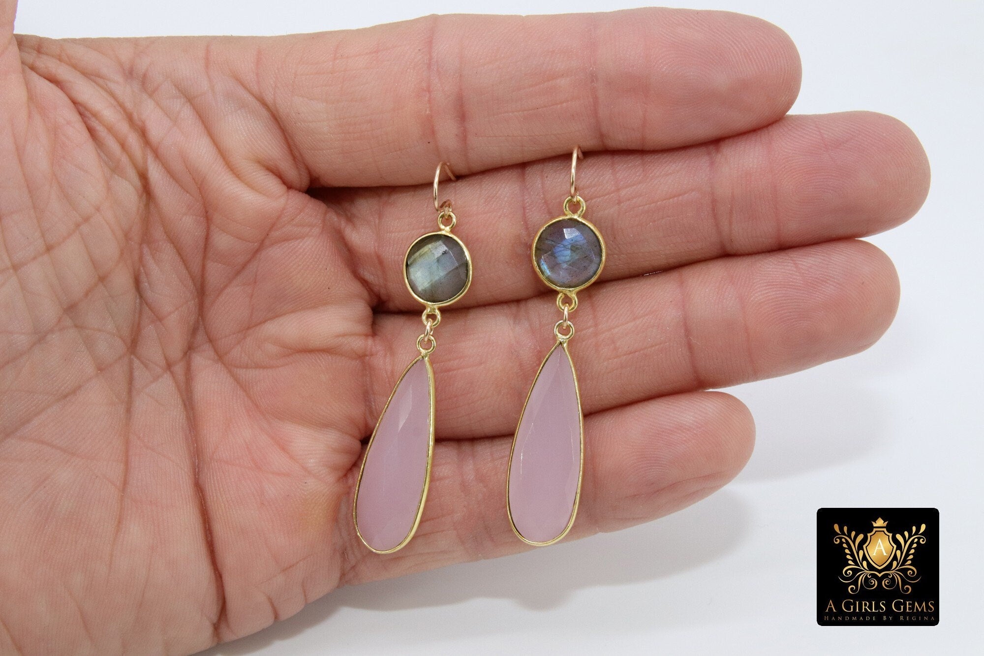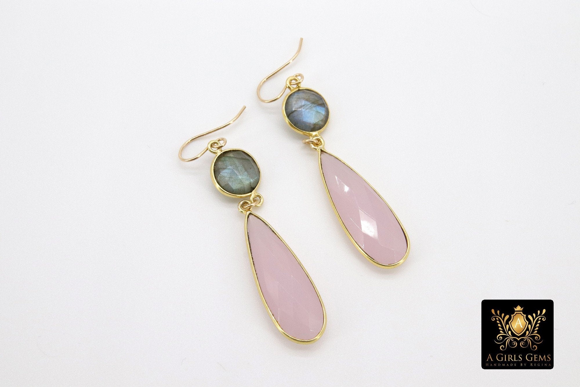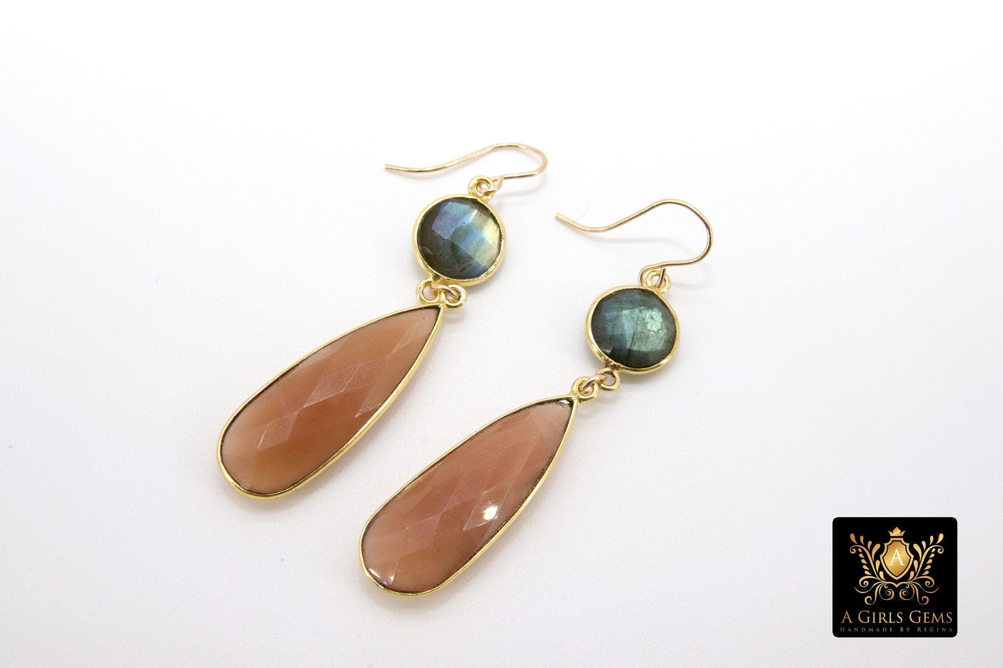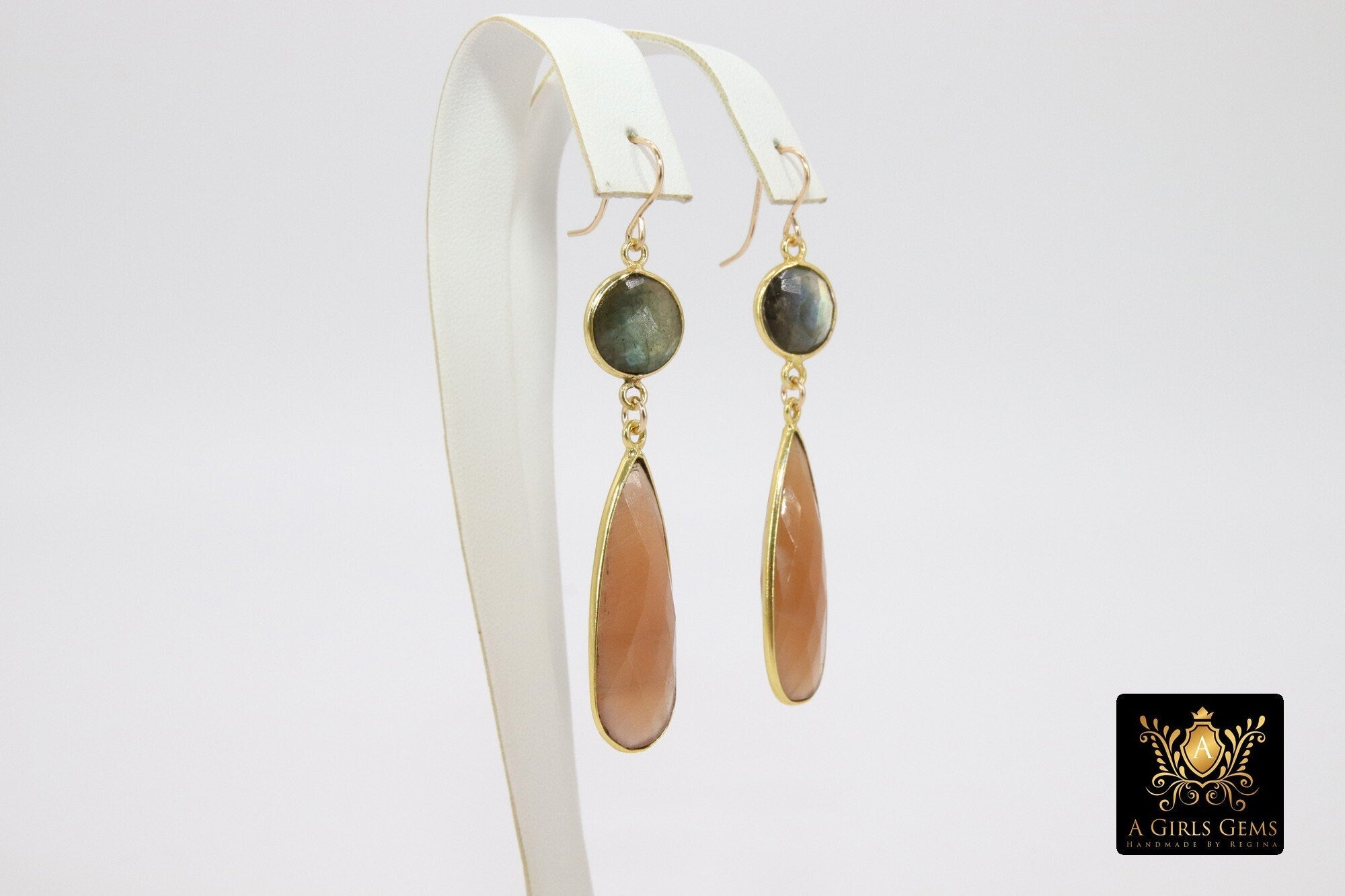 14 K Gold Filled Earrings, Pink Moonstone and Labradorite Gemstones, Dangle Teardrop Wire Hooks