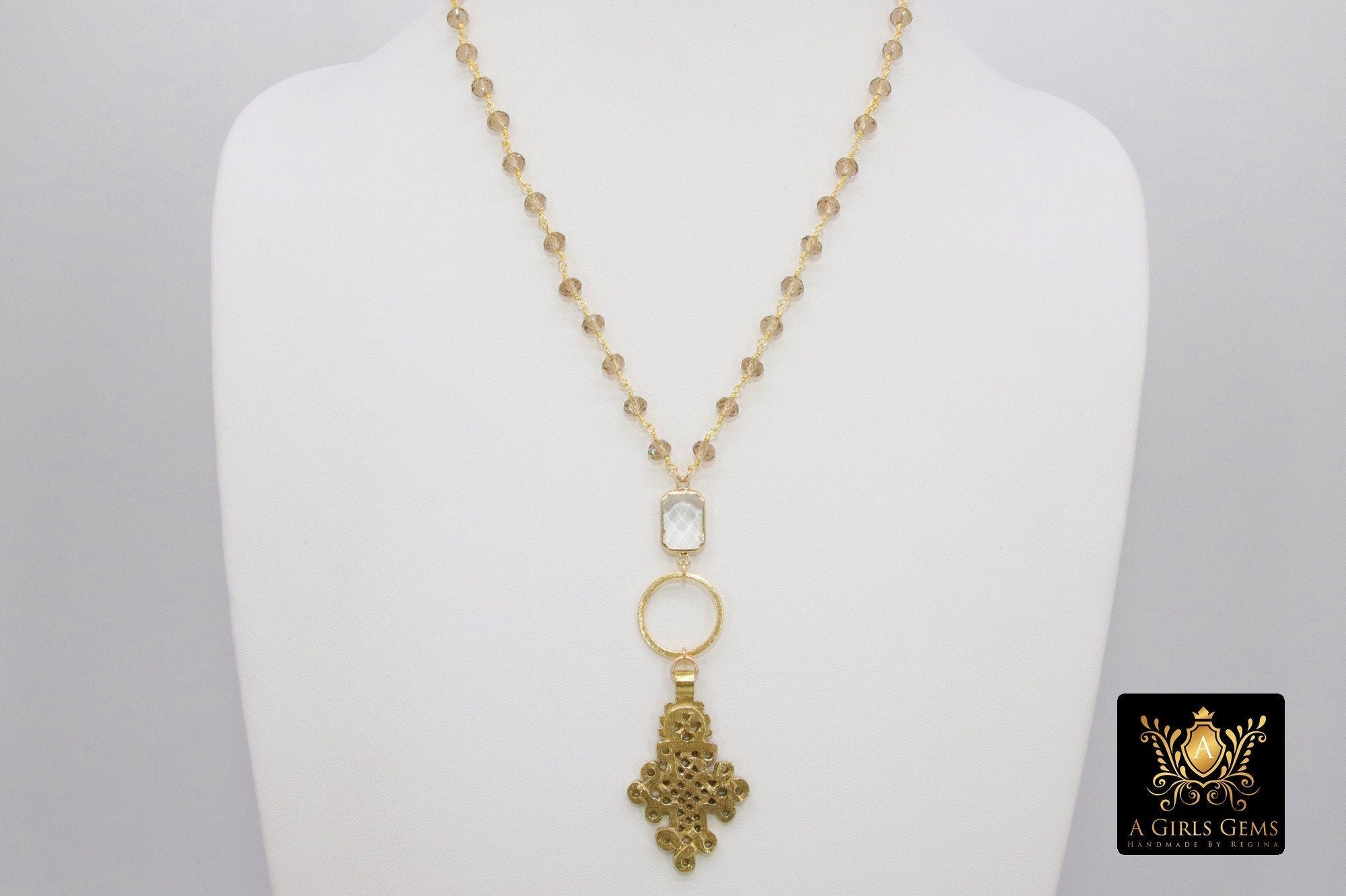 Style C is our Small Ethiopian Cross, brushed ring, and rectangle bezel on Smoky Rosary Chains