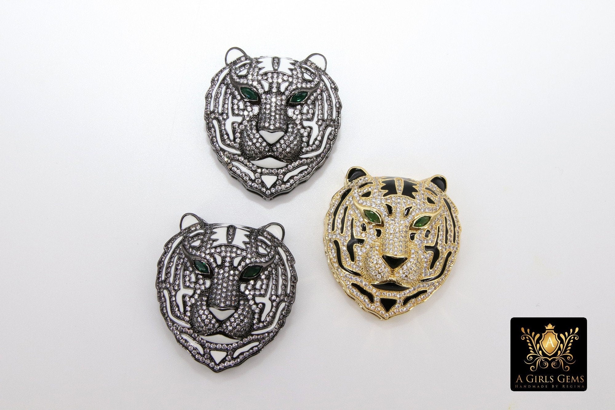 Tiger Head Pendant, CZ Micro Pave Black Tiger Saber Tooth AG# 663, White Tiger Cubic Zirconia Charms for Necklace