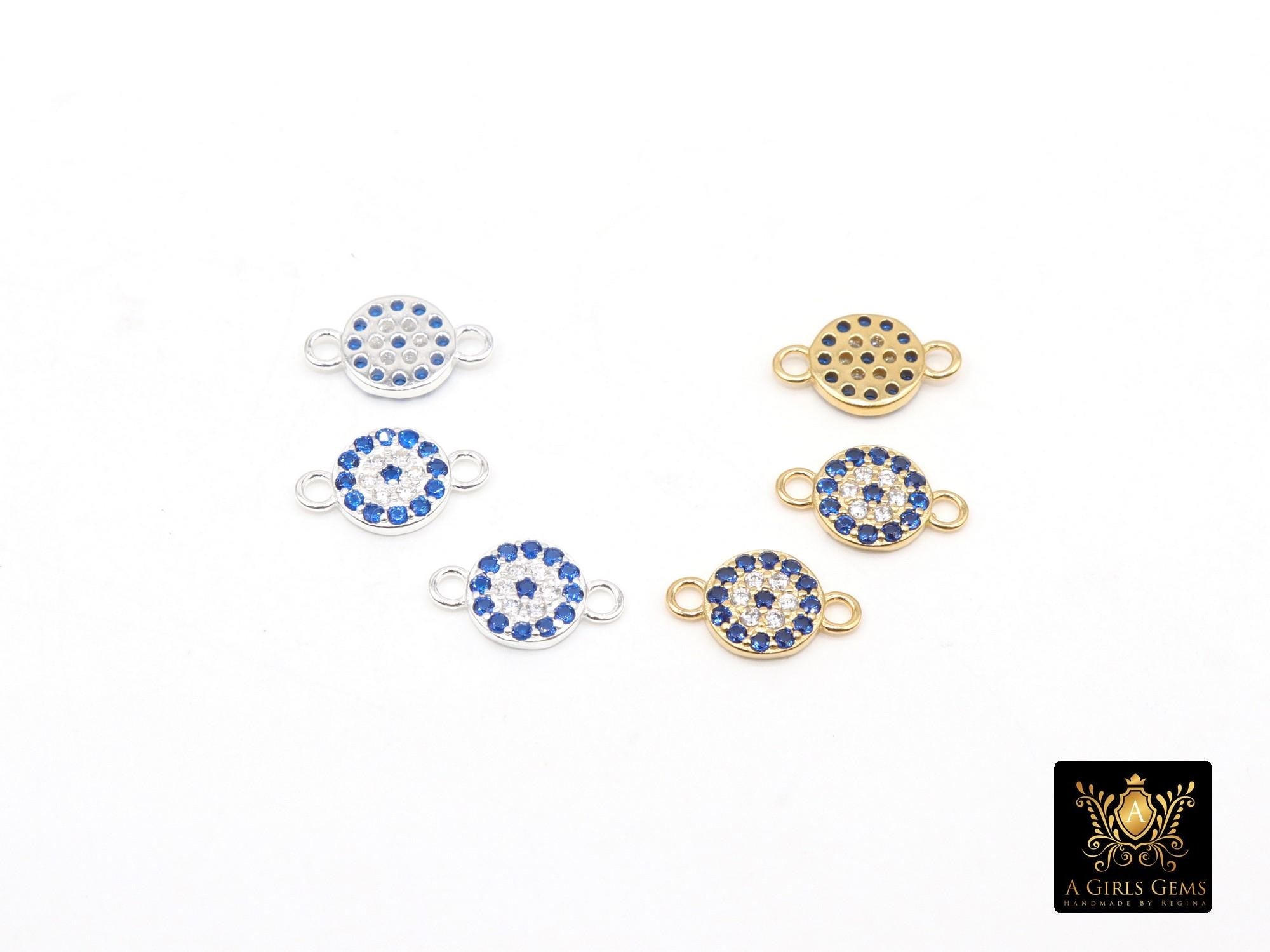 14 K Gold Filled Evil Eye Connectors, 925 Sterling Silver 6 mm CZ Micro Pave Sapphire Blue Links # 3889, Tiny Round Minimalist 2 Hole Links