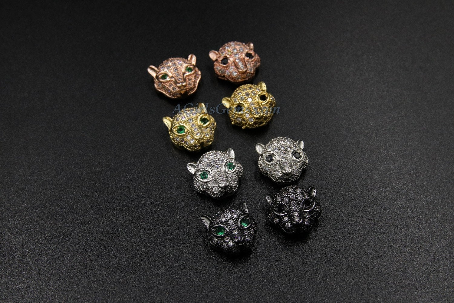 CZ Micro Pave Panther Head Bead Charm, Wakanda Head #81, Cat Head Beads 10 x 12 mm, Black Pave, Pink Fuchsia Eyes CZ Animal Head Bead