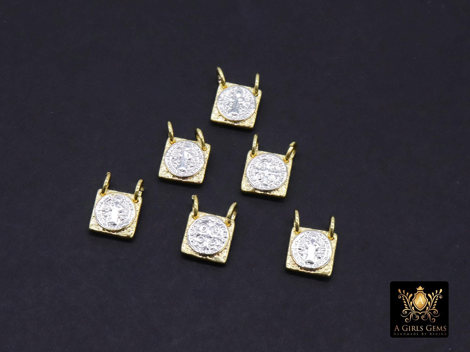 Gold St. Benito Scapular, 10 mm Cross Silver St. Benedict Rectangle Square Charms # 555, Mixed Metal Religous Medals
