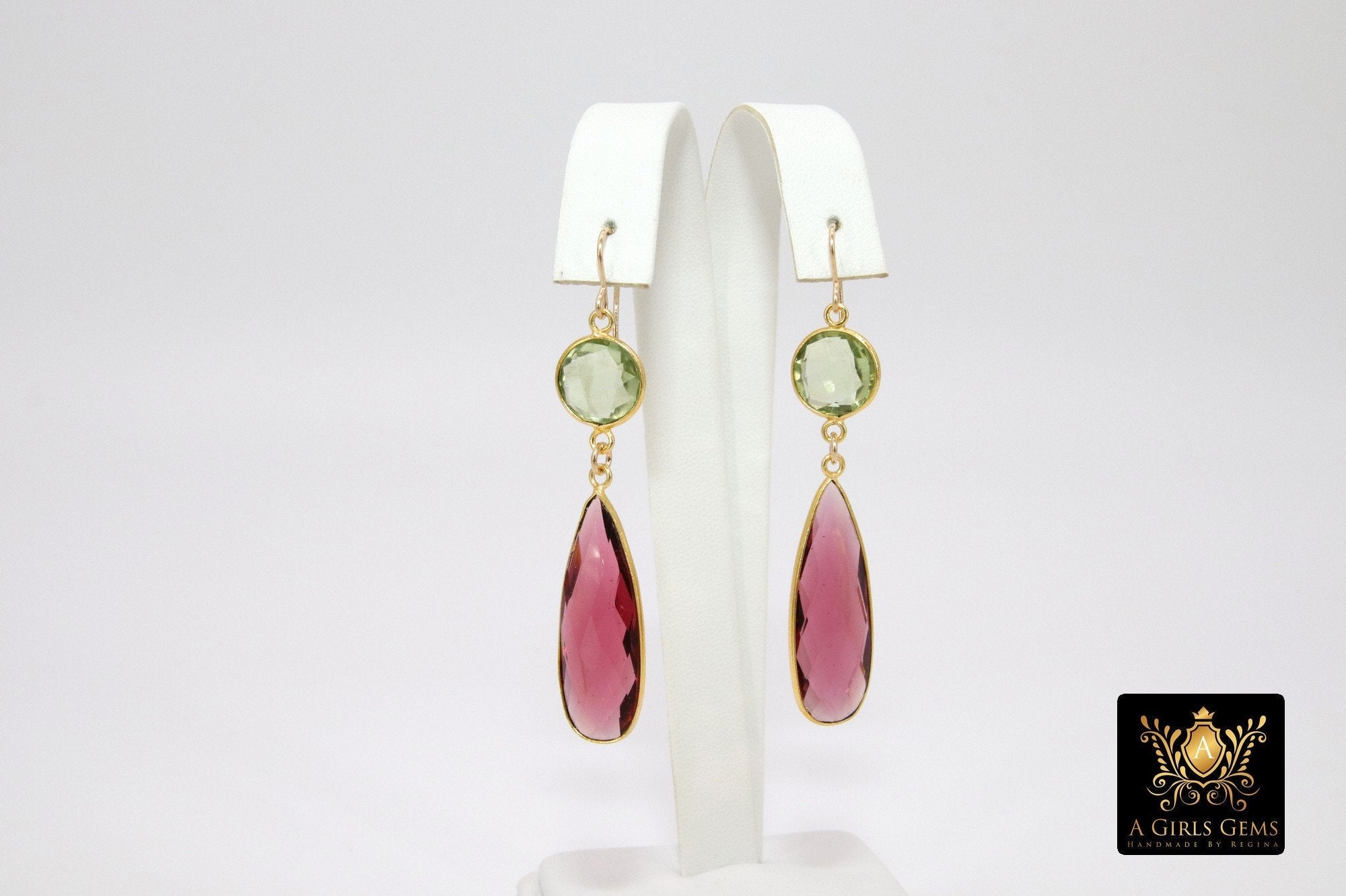 These lovely earrings are so pretty with Green Amethyst and Pink Tourmaline. Message us if you would like to customize your earrings. 14 K Gold Filled Necklace is sold separately.