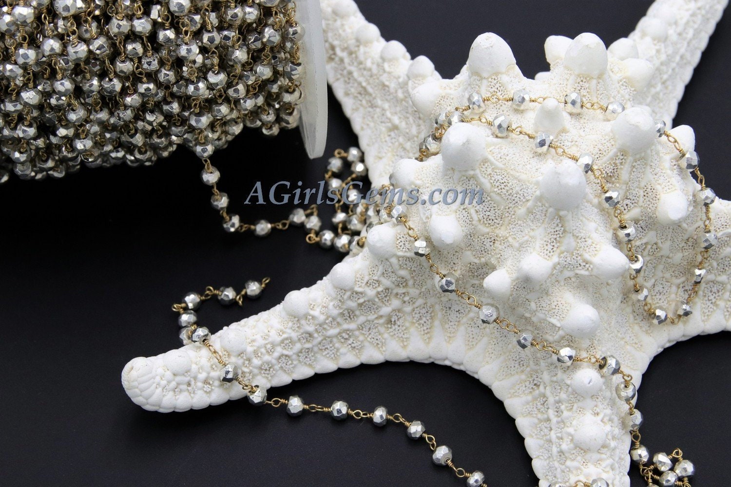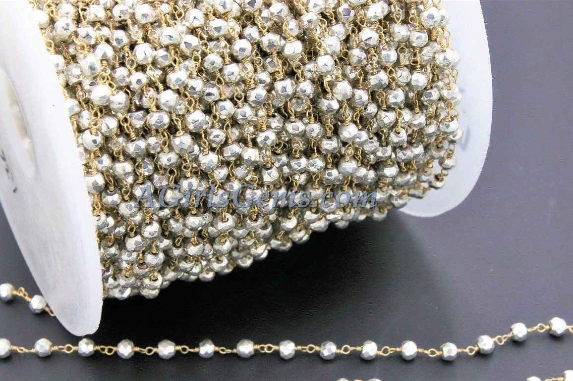 Pyrite Rosary Chain, 4 mm Natural Faceted Bright Silver/Gold Pyrite Bead, Quality Wire Wrapped Chains, Silver and Gold Chains by the Foot