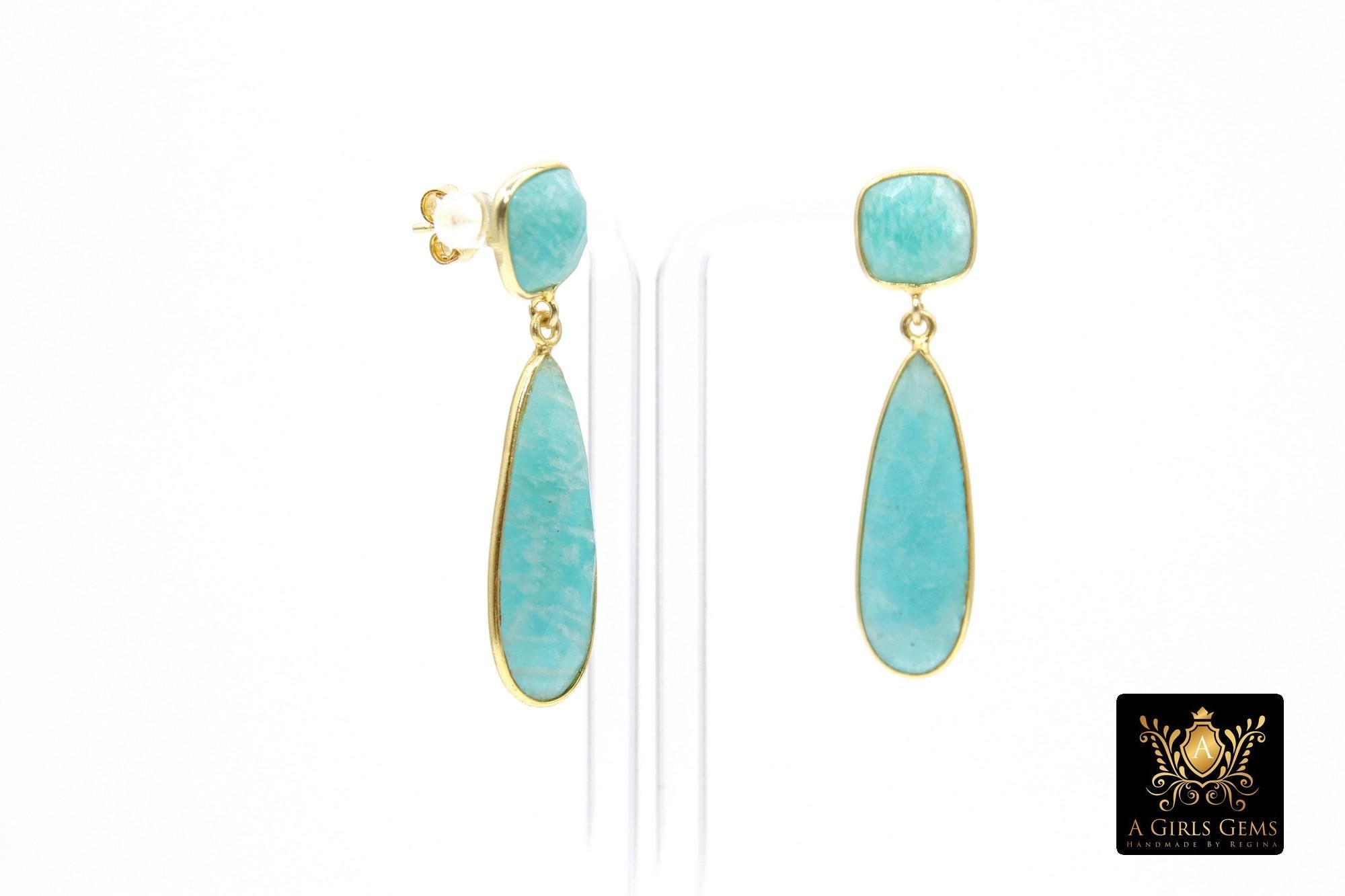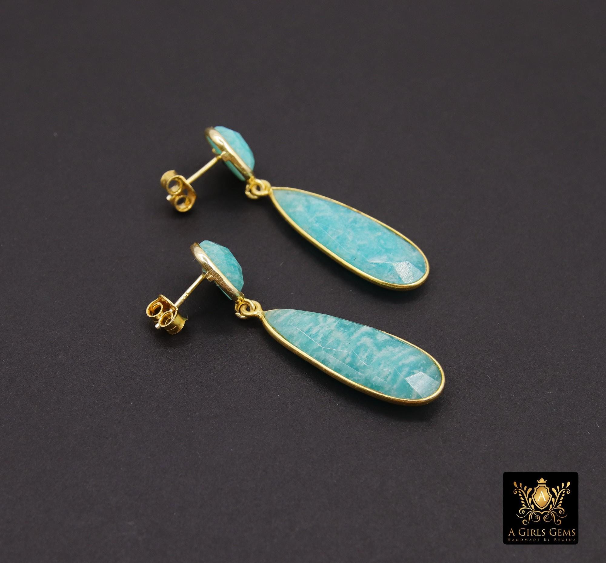 Amazonite Stud Earrings, Aqua Blue Gold Over 925 Silver Teardrop Gemstone, Dangle Earring Jewelry