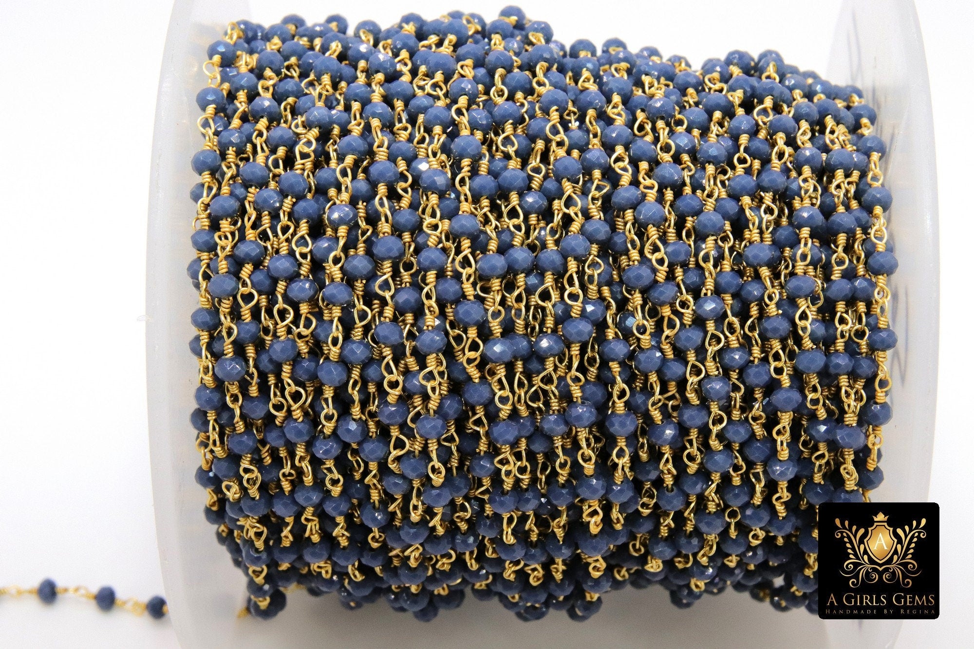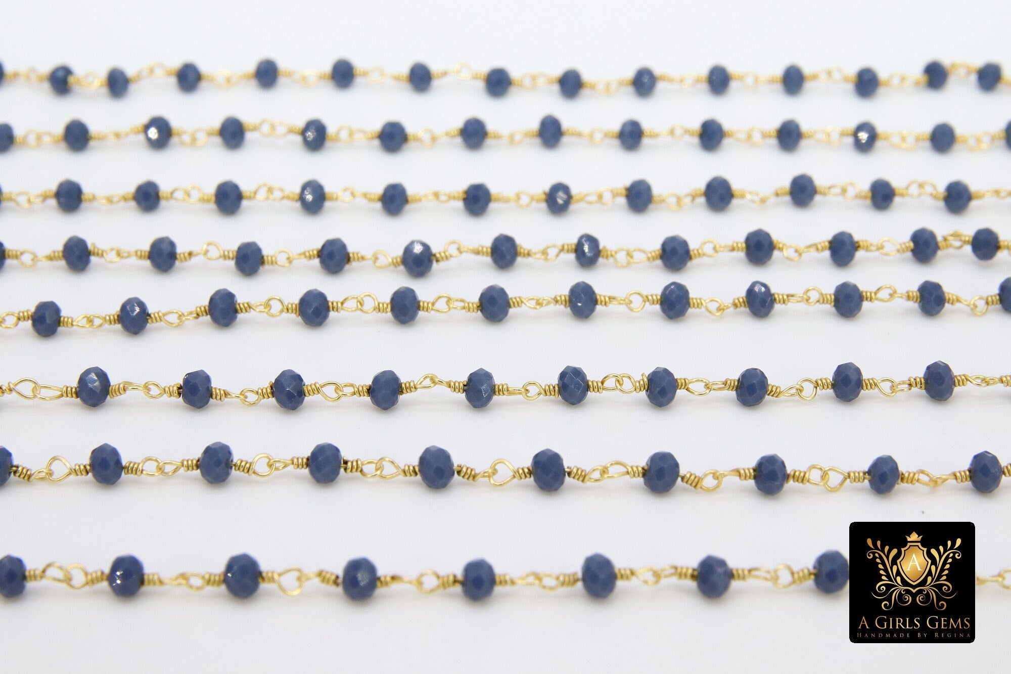 22k Gold Plated Sapphire Blue Crystal Rosary Chain, 4 mm Unfinished Bead Wire Wrapped Chains