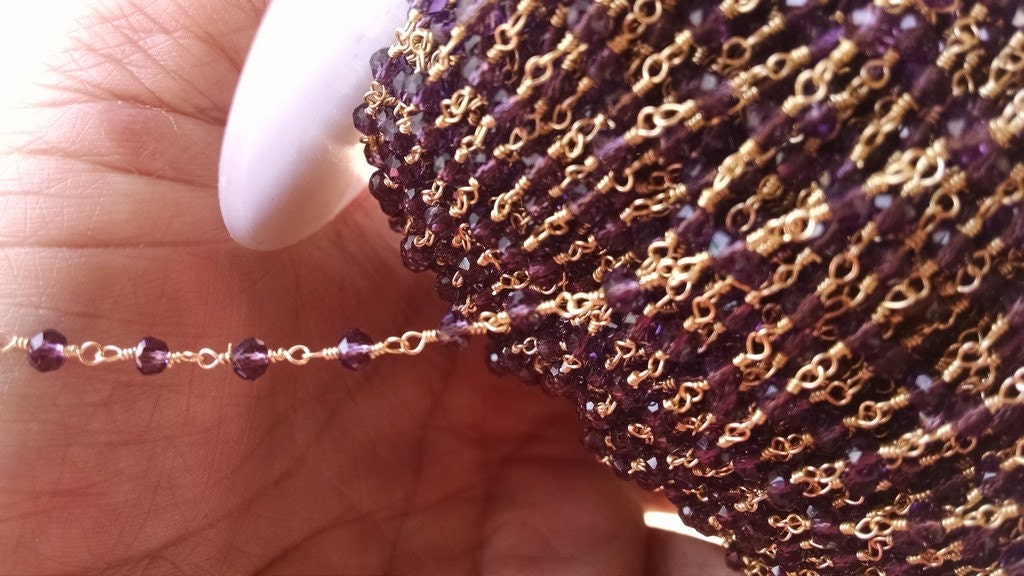 22k Gold Plated Amethyst Rosary Chain, 4 mm Purple Crystal Beaded Chains CH #305, LSU Jewelry Bulk