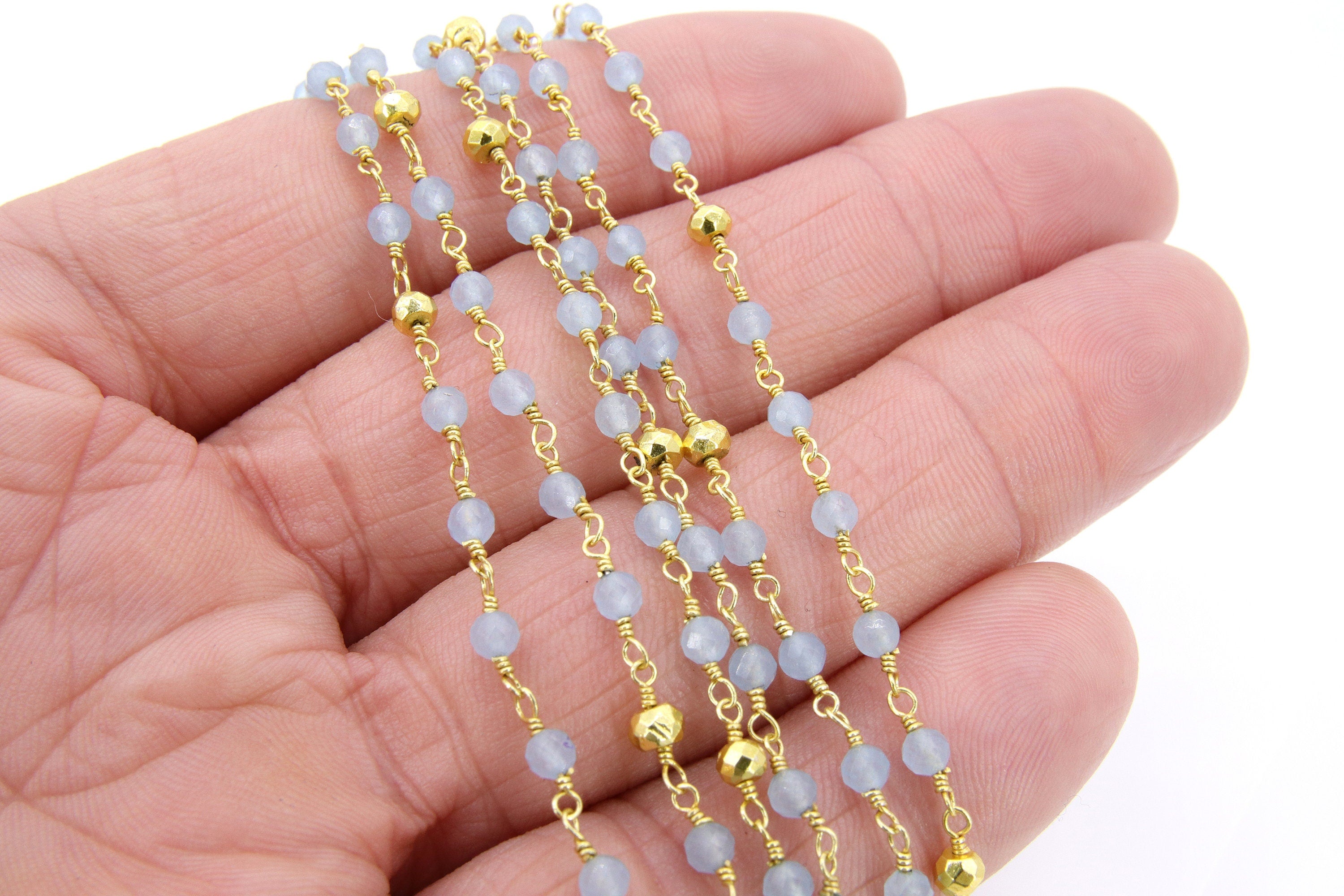 Aquamarine Rosary Chain 4 mm Faceted Pyrite Beaded Wire Wrapped Rosary Chain by the Foot 22 k Gold Gemstone Rosary.