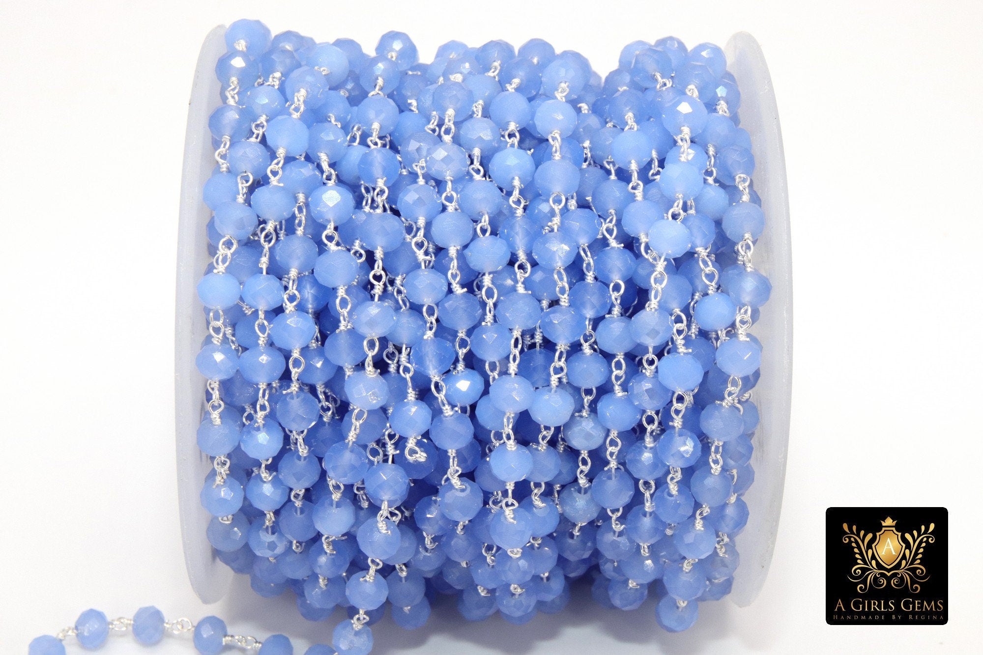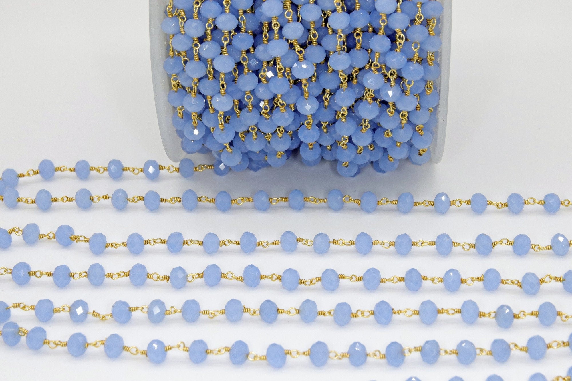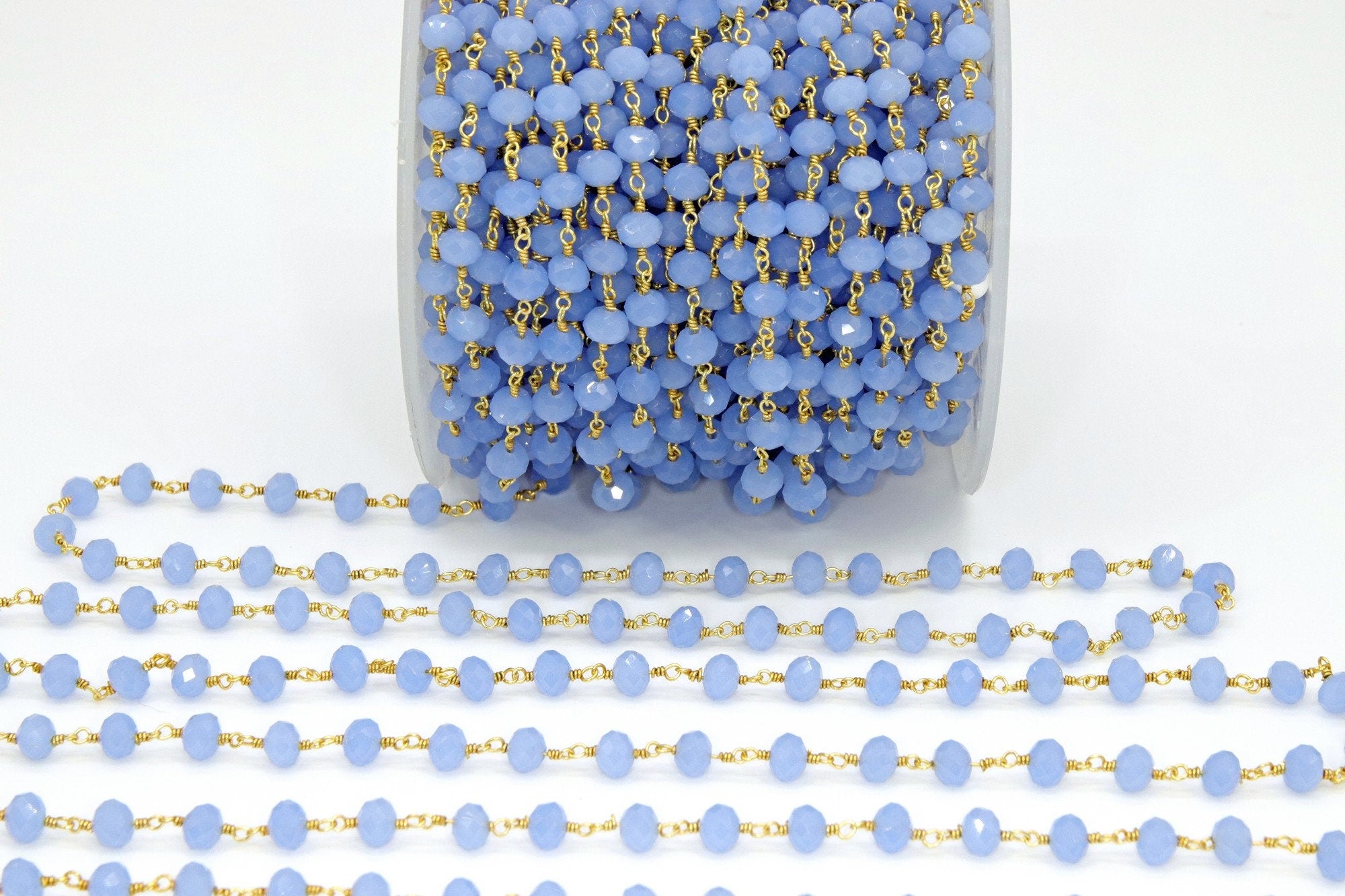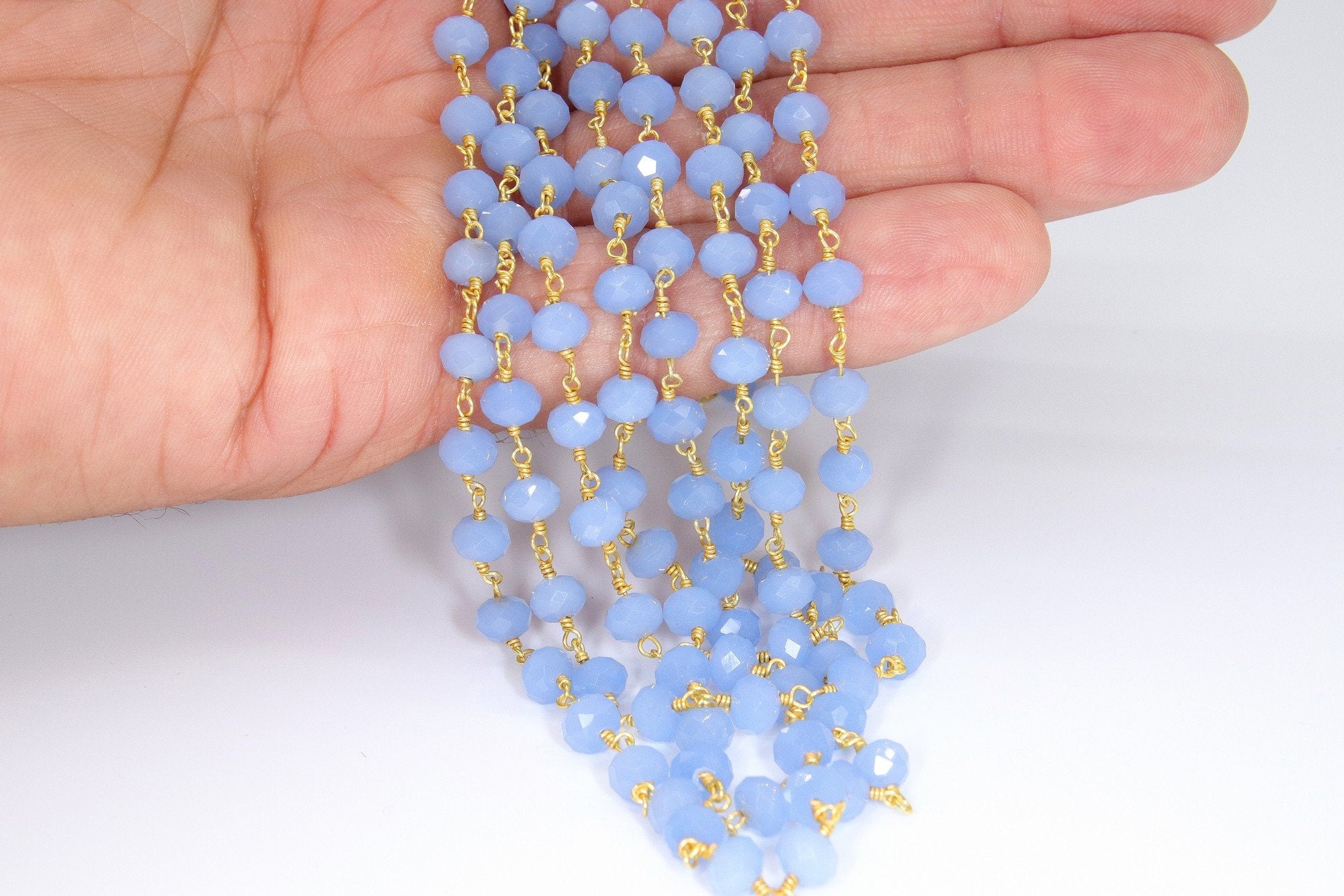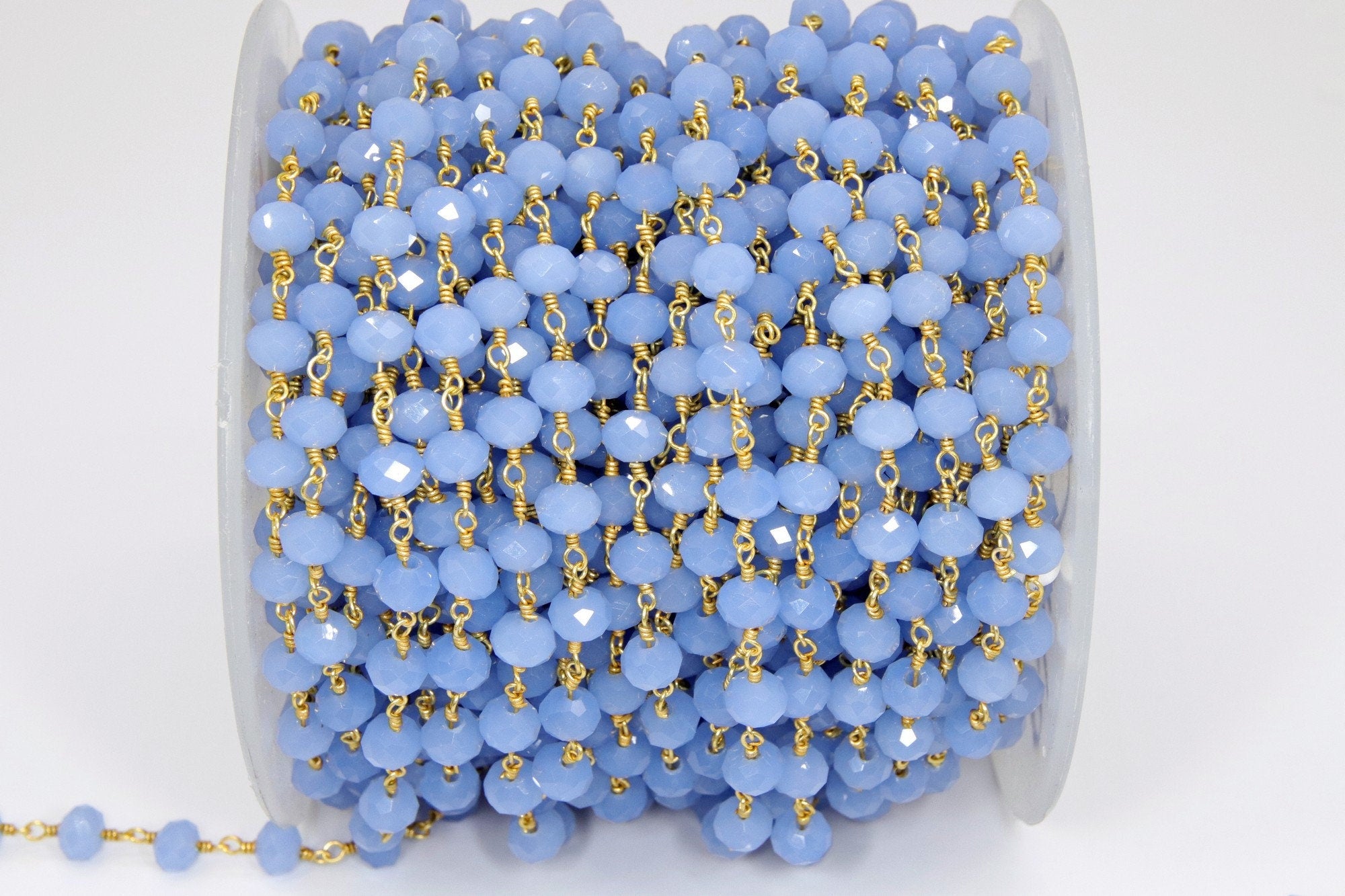 Baby Blue Chalcedony AB Rosary Chain, 6 mm Gold Wire Wrapped Crystal Jewelry Beads CH #513, Unfinished Bulk Wholesale Powder Blue Bead