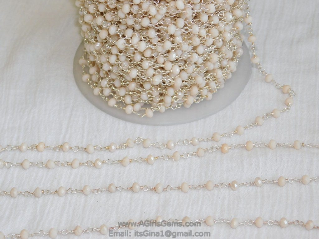 Light Cream Ivory Silver Rosary Chain, 4 mm Silver Wire Wrapped Chains CH #410, Cream Ivory Crystal Glass Rosary