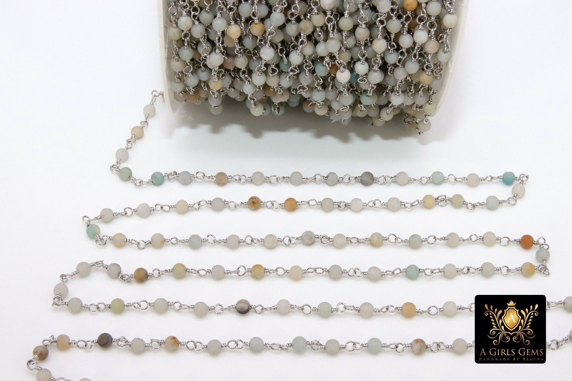 Natural Amazonite Rosary Chain 4 mm Beaded Wire Wrapped Rosary Chain by the Foot. Silver Wire Wrapped Chain. You can also find this chain in a 6 mm size.