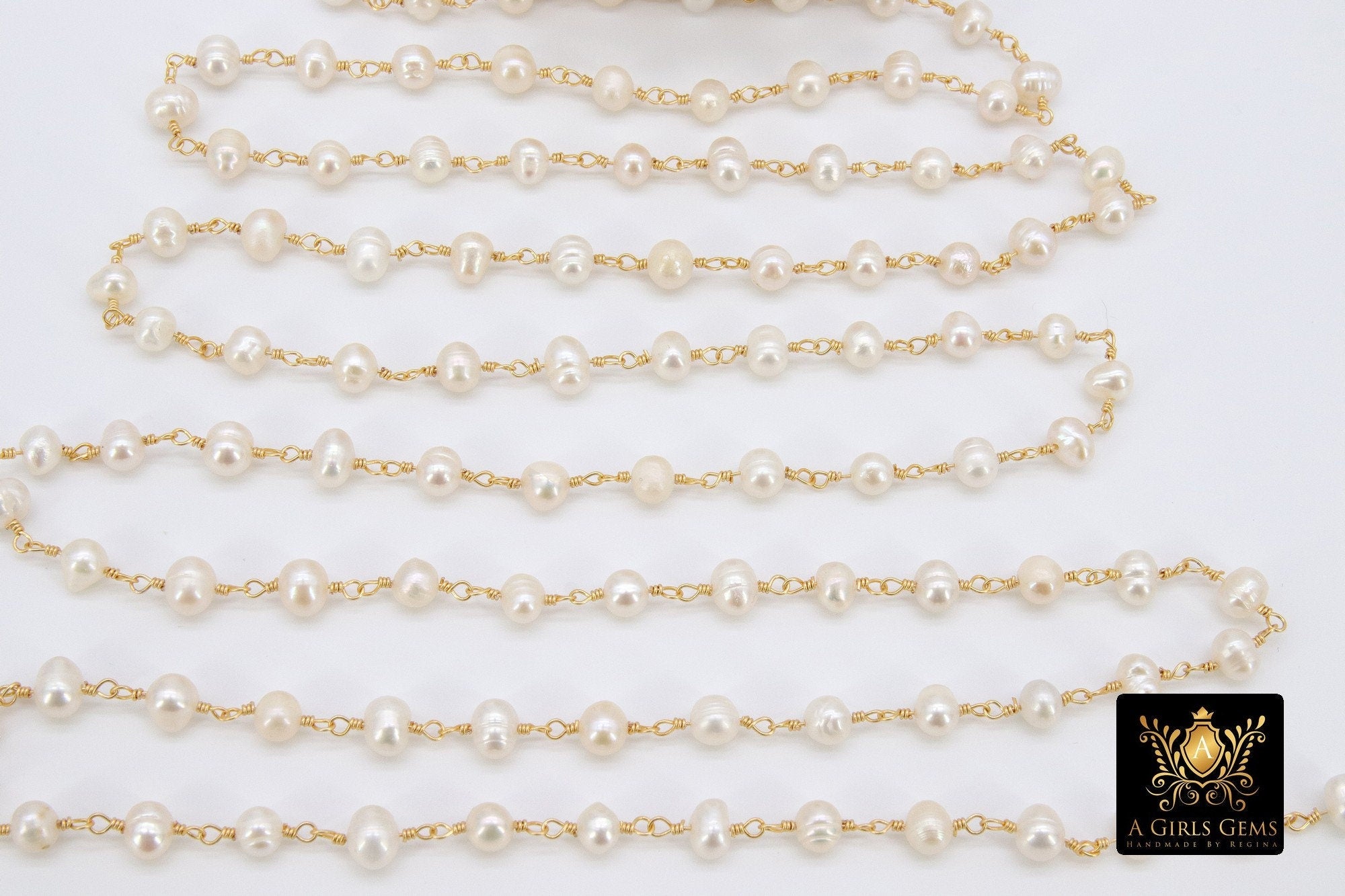 Freshwater Pearls, 6 mm Gold Wire wrapped Rosary Chain, Pearl Rosary Chain Boho Jewelry Chains