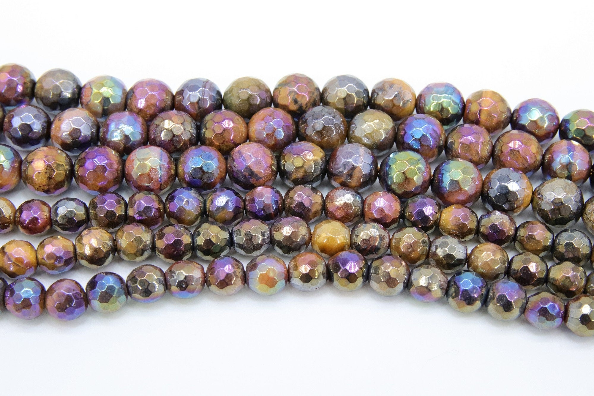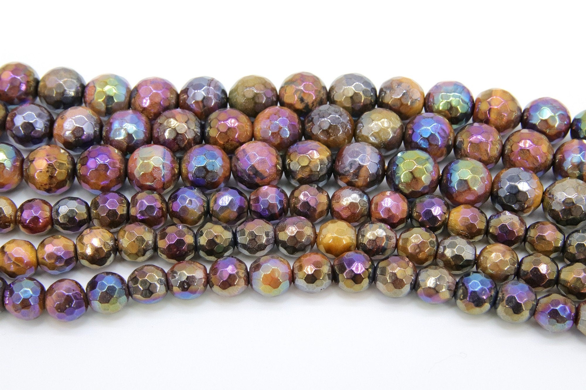 Beautiful strand of Tiger Eye AB Electroplated Faceted Beads comes in a faceted round shades of browns, mahogany, purple titanium colors toned lighter with the plated coating. It is known to bring protection and good luck to the wearer. It has the power to focus the mind, promoting mental clarity, assisting us to resolve problems and objectively which is unclouded by emotions. Particularly useful for healing psychosomatic illnesses, dispelling fear and anxiety.