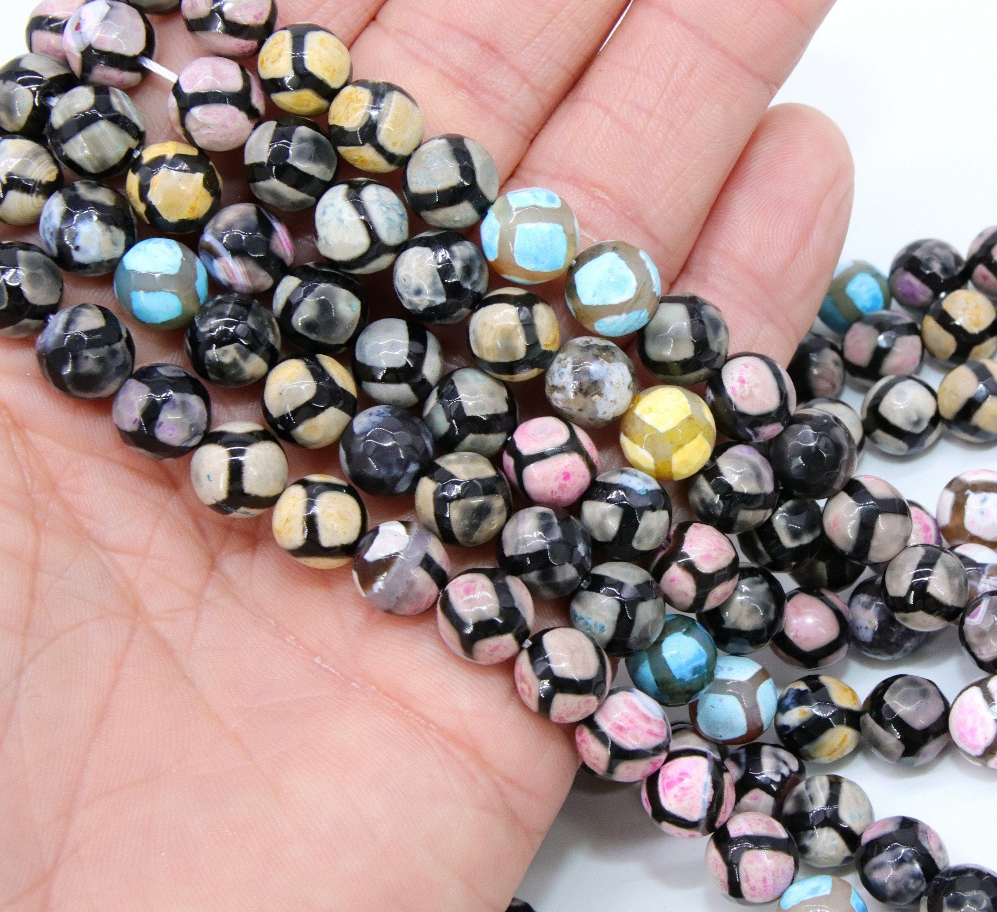 Beautiful strand of Tibetan Natural Faceted Agate beads in shades of black, blues, yellow and pinks in blended creams. It is known to bring shine, brightness, clearness, and splendor. It is also known for it's protective and magical energy.