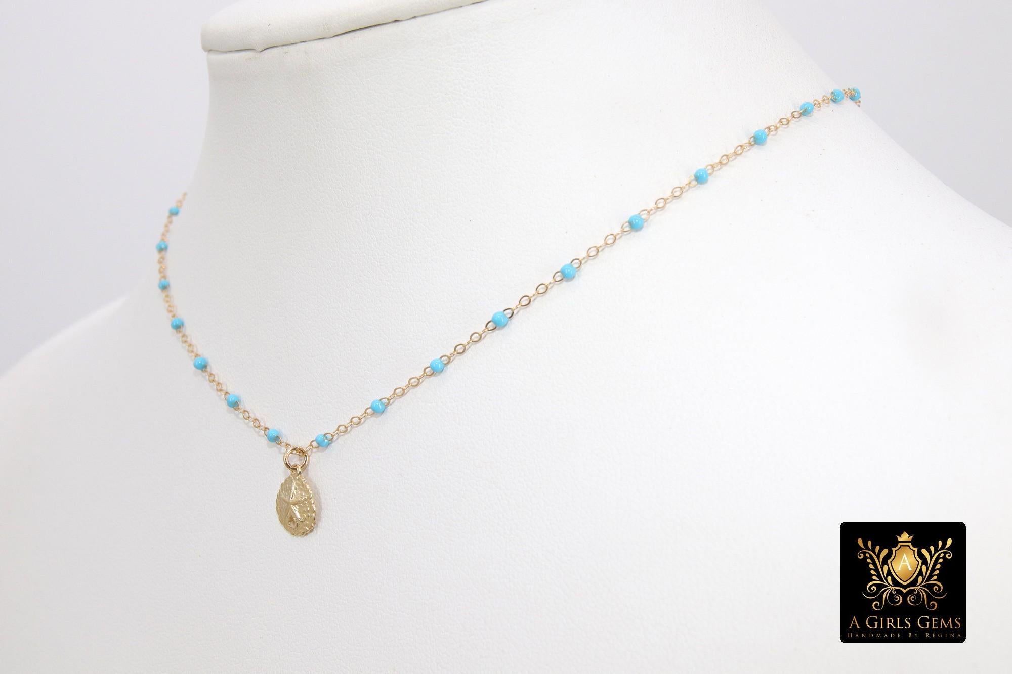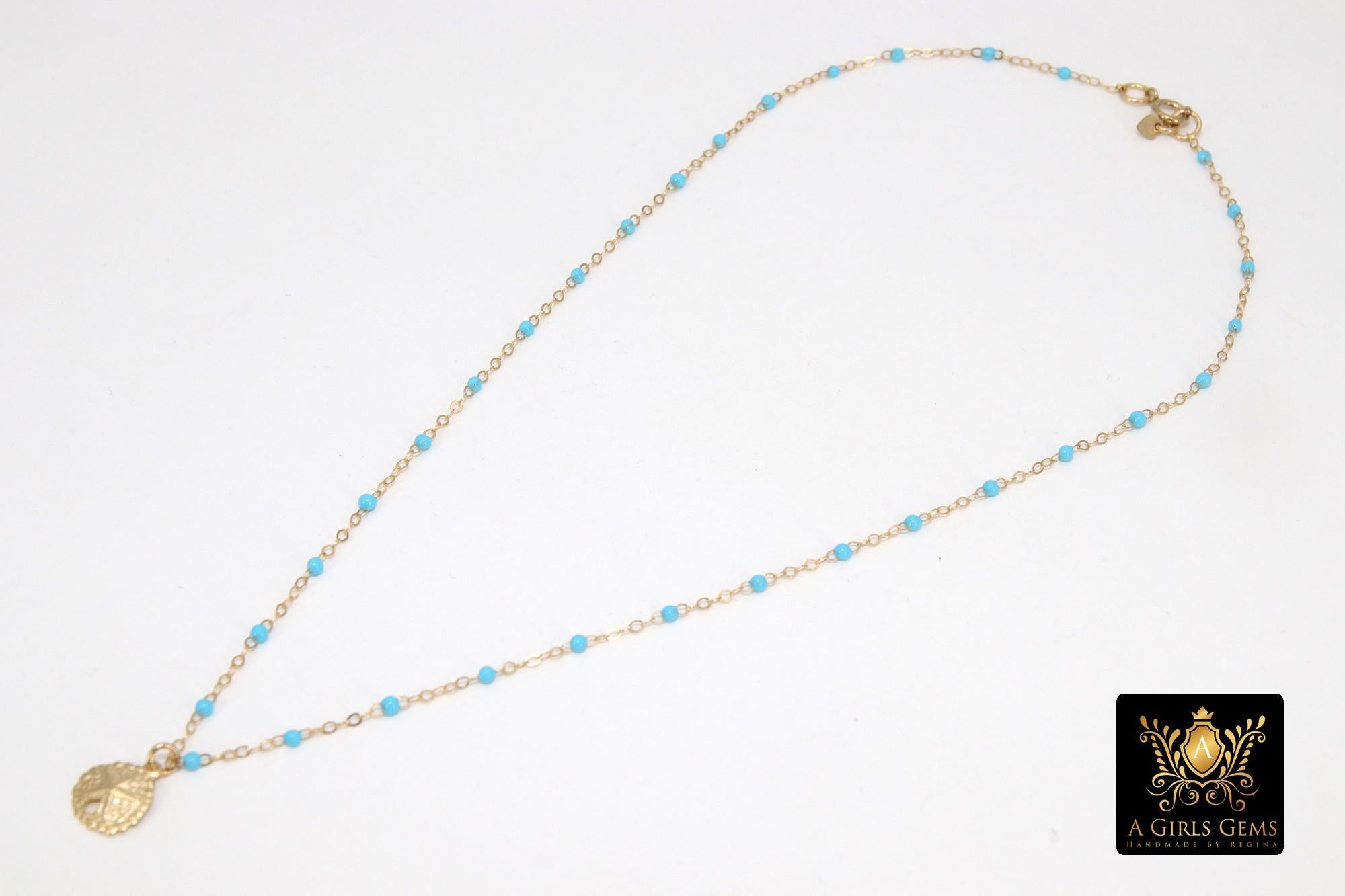 14 K Gold Filled Sand Dollar Beach Necklace, Shown in our Blue Turquoise Gold Satellite Chain Link Charm Choker. Choose Your Color: Fuchsia Pink, Black, Blue Turquoise, Navy Blue, Multi Color, White, Purple, Lavender