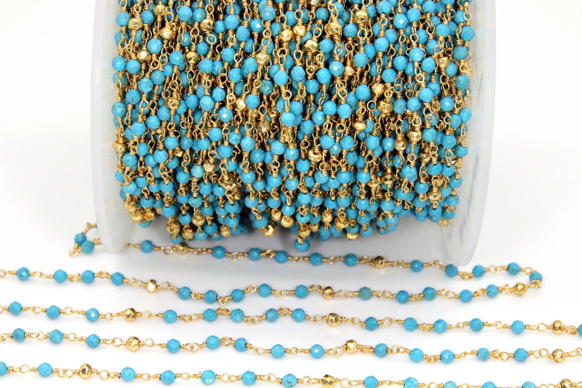 Blue Turquoise Rosary Beaded Chain, 4 mm Wire Wrapped Gold Pyrite Blue Howlite Chain for Necklace Chains, By the Foot