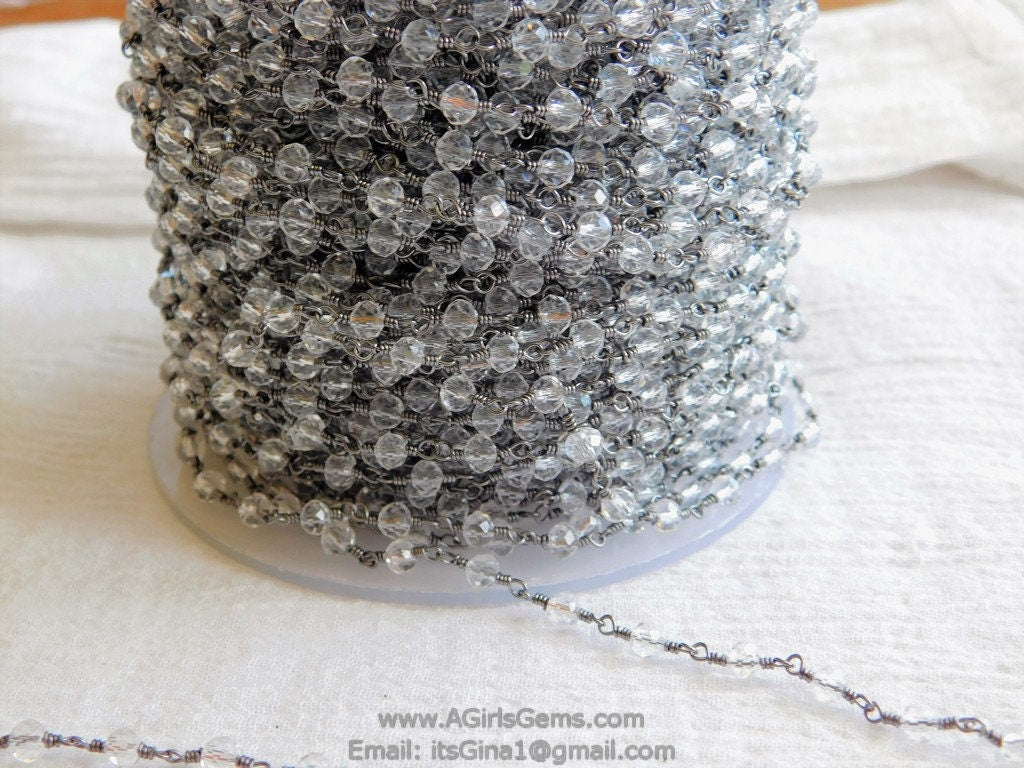 Clear Crystal Rosary Chain, Gunmetal Black Faceted CH #324, 4 or 6 mm Beaded Chains
