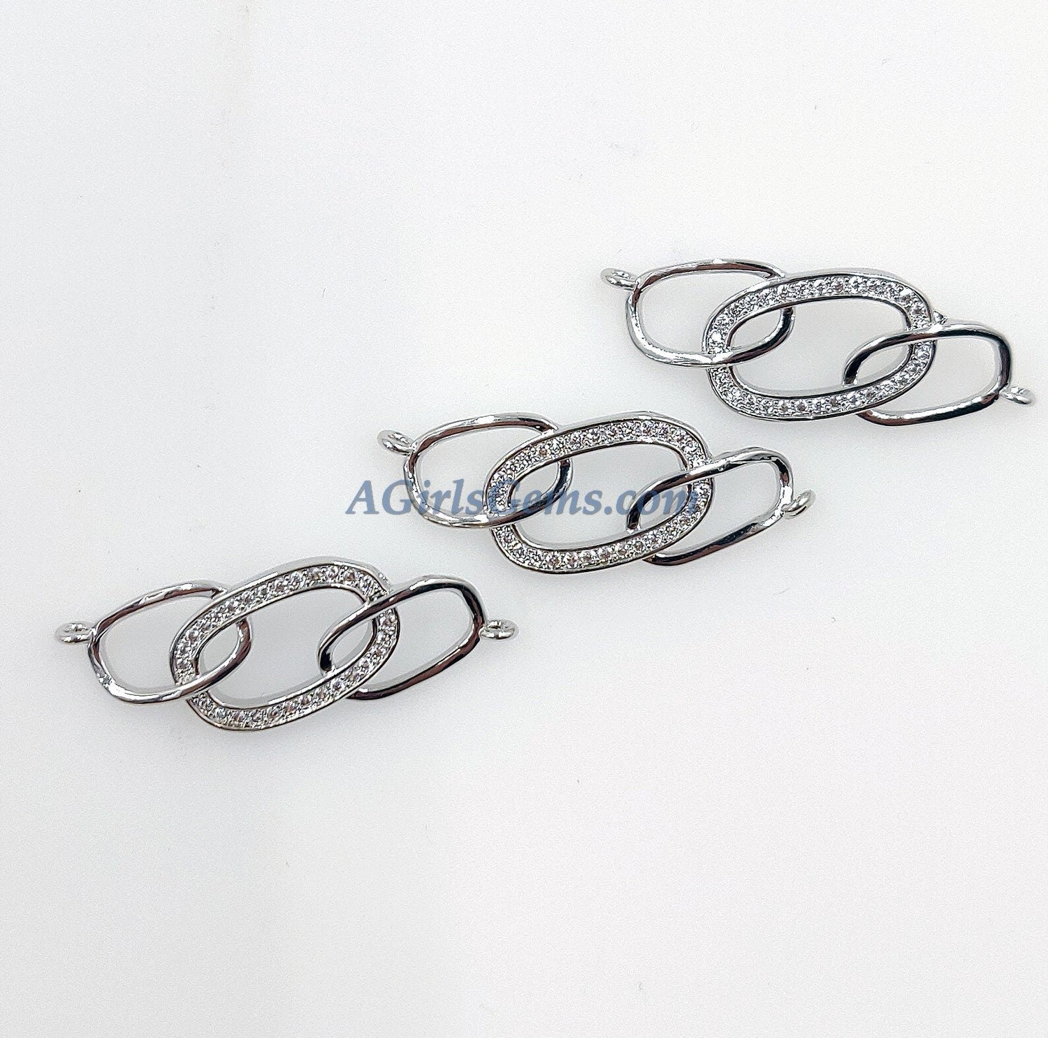 CZ Micro Pave Bar Charm Connector, Long Bracelet Bar 18 k Rose Gold/Silver/Gold/Black Rhodium Square Curved 2 Loop Oval Jewelry Findings