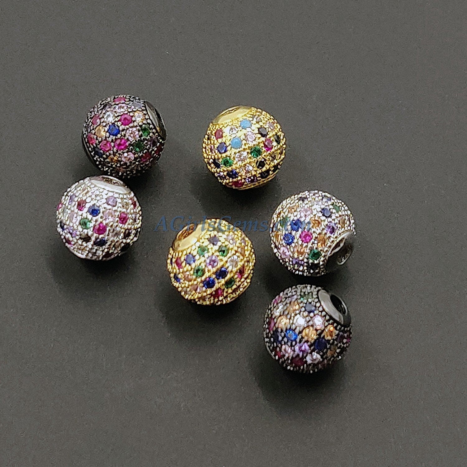 CZ Micro Pave Rainbow Balls, 2 Pcs 6 mm Gold Multi Colored Round Beads, 10 mm Black Silver Focal Bead