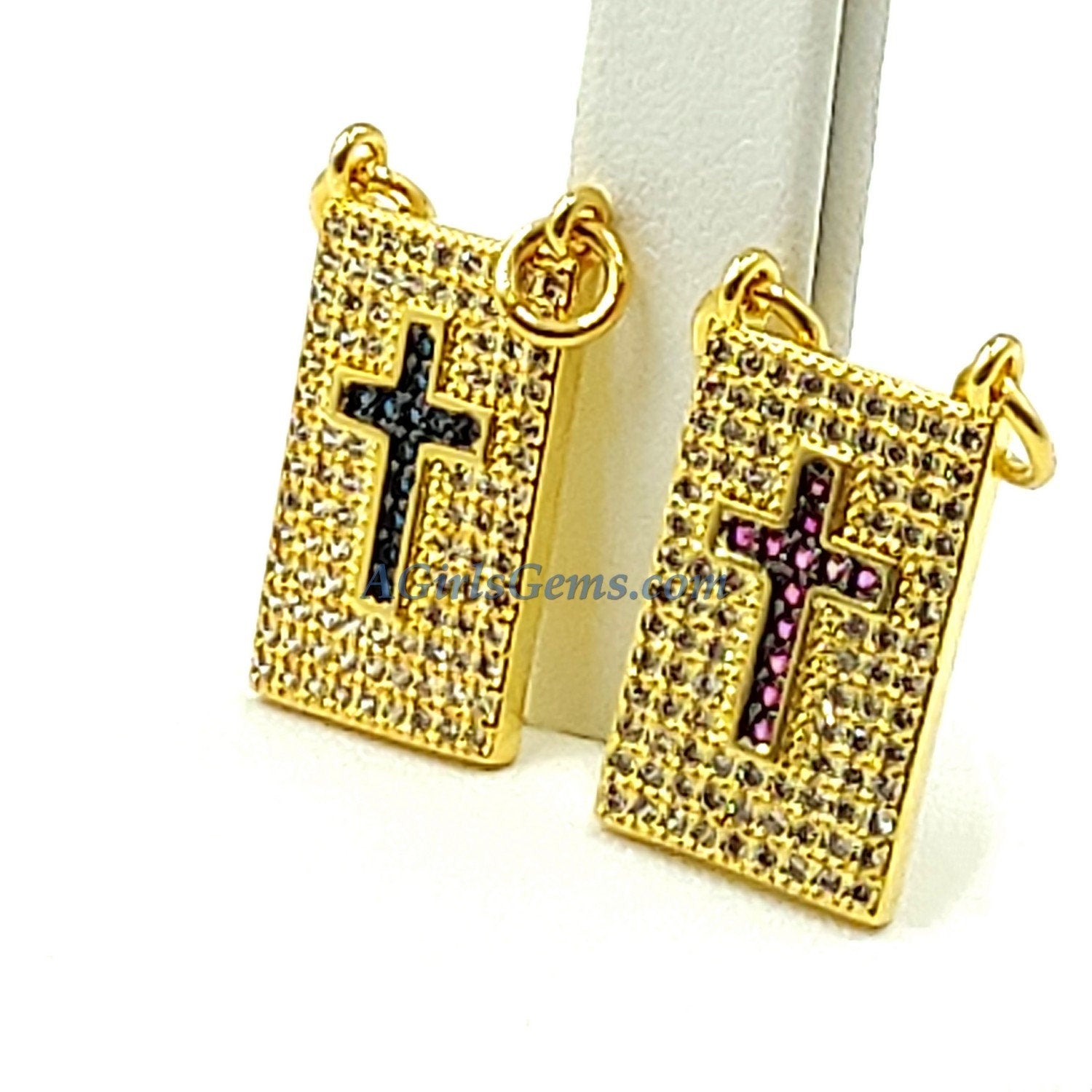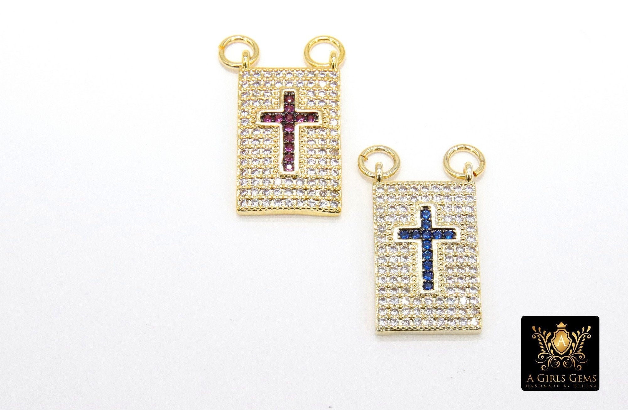 CZ Sapphire Blue or Pink Cross charms in a 2 jump ring Scapular Style Charm. These are small and delicate. Perfect for gold chains or rosary chain necklaces. Your can find other scapula style charms in our shop with hearts.