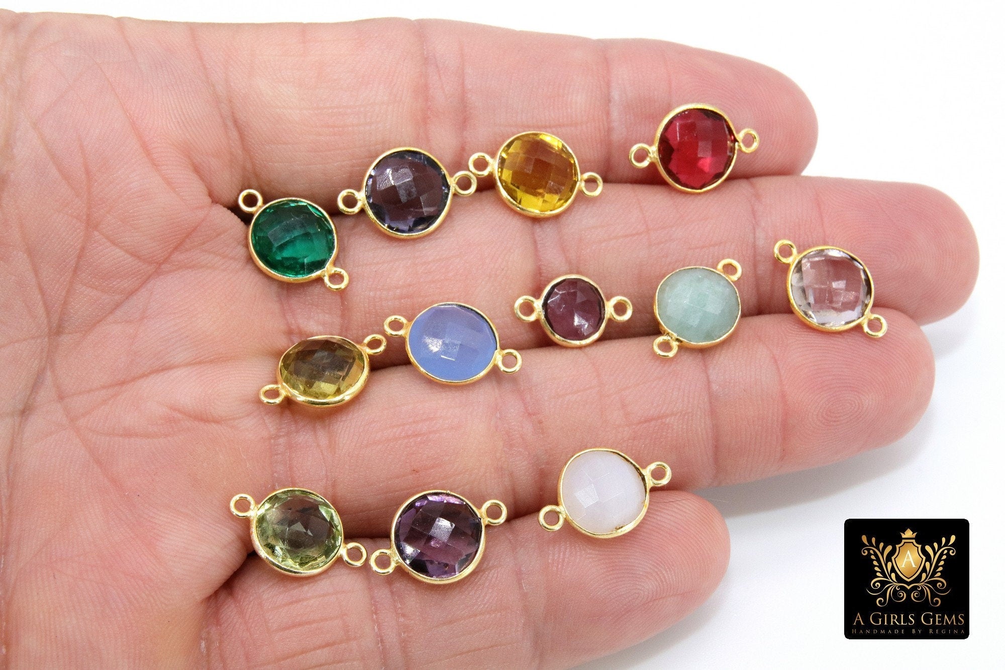 Gold Round Gemstone Connectors, 8 mm Bezel Links #2188, 10 mm Gold Over 925 Silver