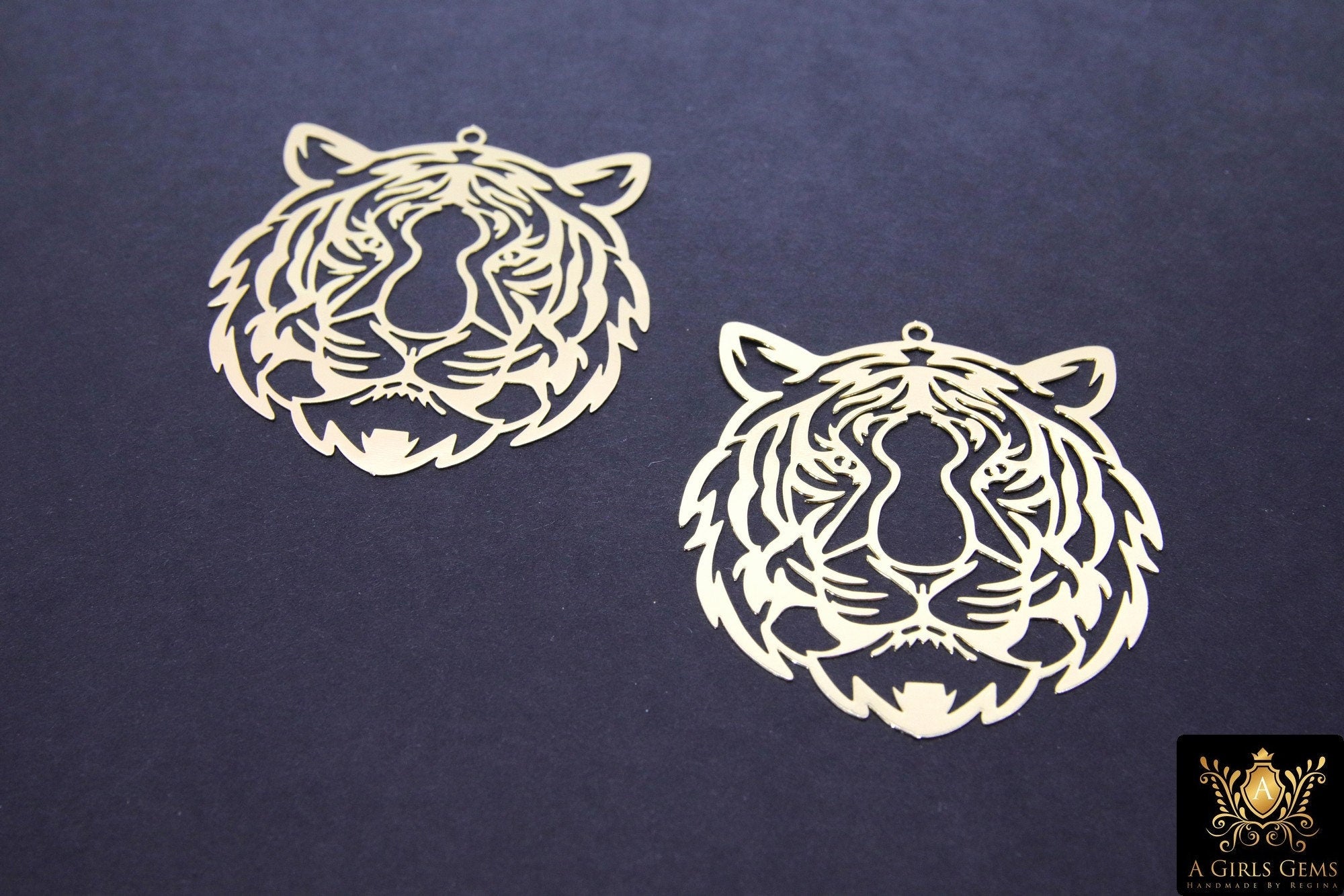 Gold Tiger Head Charm, Reversible Gold Plated Striped Tiger Head AG #3232, 43 mm LSU Animal Head Beads Charms