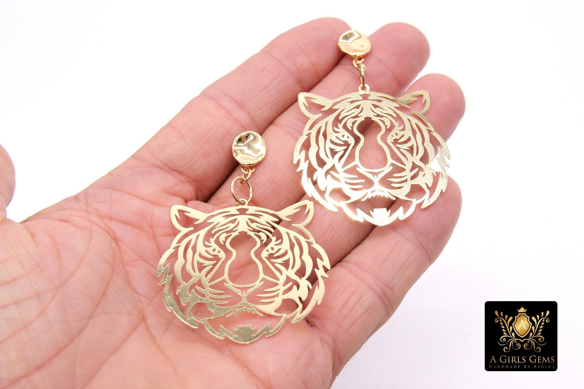 These earrings have 10 mm earring studs in genuine gold plated. Come with silicon backs and gold plated tiger heads. 14 k gold filled rings are used. Message us if you would like to customize your earrings.